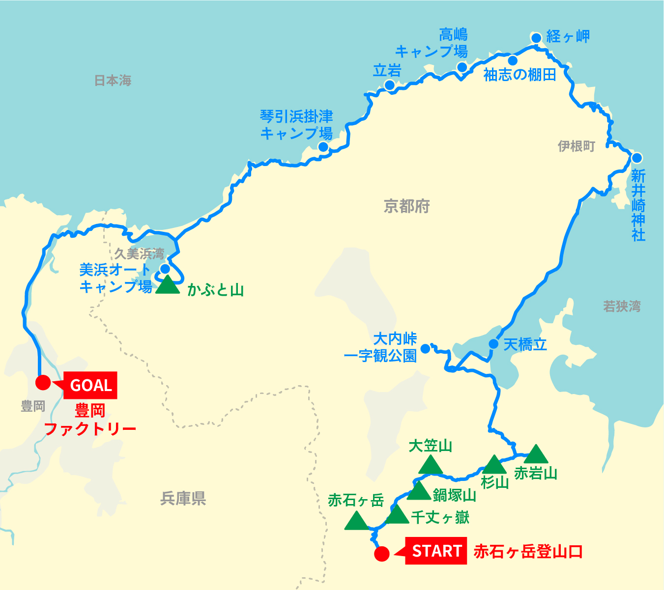 大江山連峰トレイルメインルートからスタート。丹後半島を海沿いにぐるりと歩き、山陰海岸ジオパークトレイルの一部を巡りながら豊岡ファクトリーを目指す。