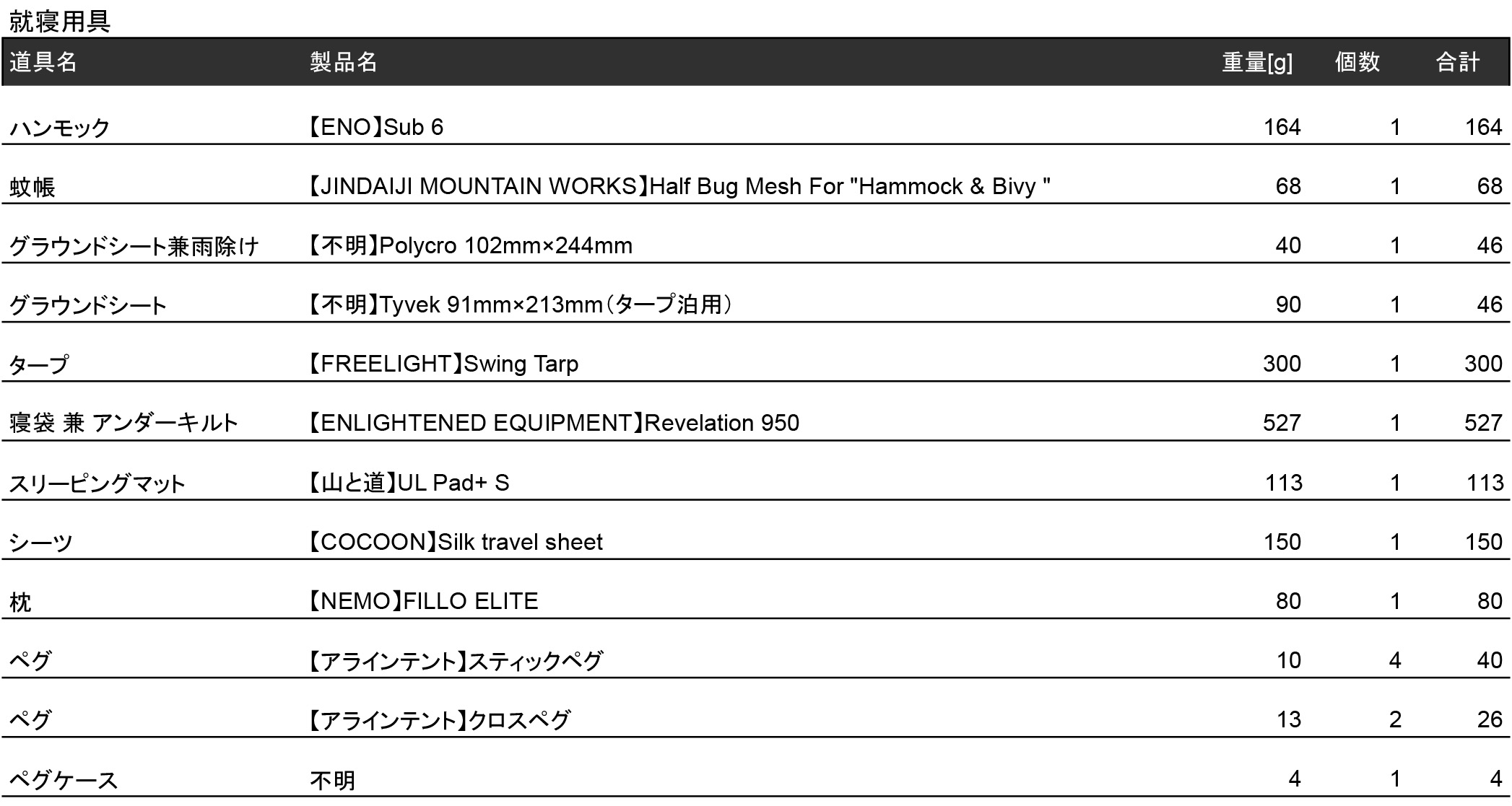 スリーピングシステムは、場所によってハンモック泊とタープ泊を使い分けました。適当な木がある場所ではハンモック(イーノ/サブ6)を選択。タープ(フリーライト/スウィングタープ)は雨除けの屋根、キルトタイプの寝袋(エンライト・イクイップメント/レヴェレーション スリーピング キルト 950)をアンダーキルトとして利用するスタイルに。