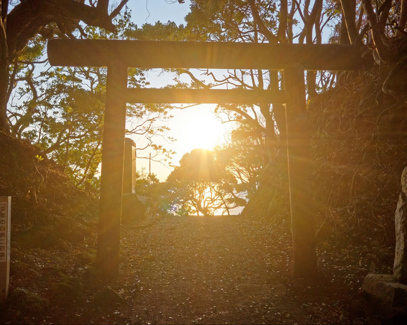 「徐福上陸の地」とされている新井崎神社。鳥居の中心に朝日が登ってくるという神々しい瞬間。
