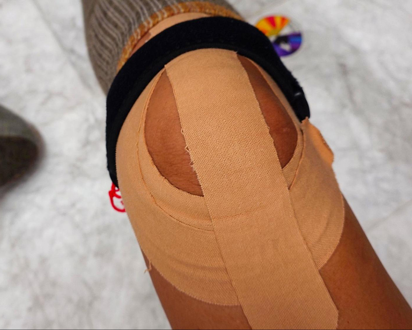 スキーとサッカーで痛めた膝の不安を解消するために念入りにテーピング。膝下につけたサポーターは連日装着した結果、皮膚がかぶれてしまい途中から取り外した。