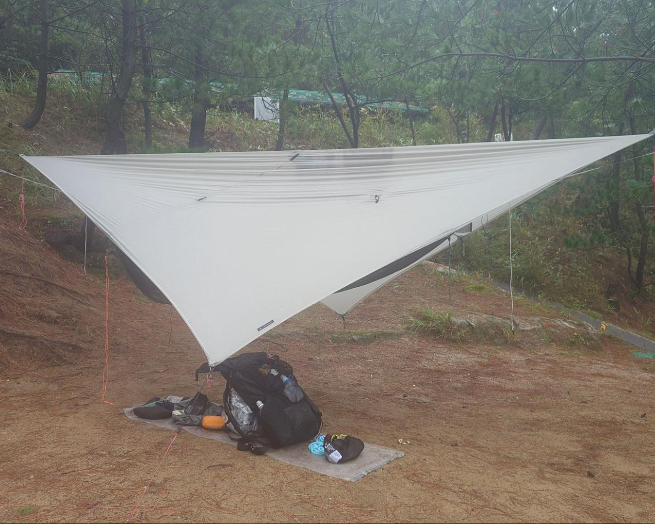 地面があまり良い状態でなく、手頃な木もあったため宿泊はタープとハンモックの組み合わせに。UL All-weather Coatを足元側のトップキルト兼雨除けカバーとして利用したのだが、この日も誤算がひとつ。