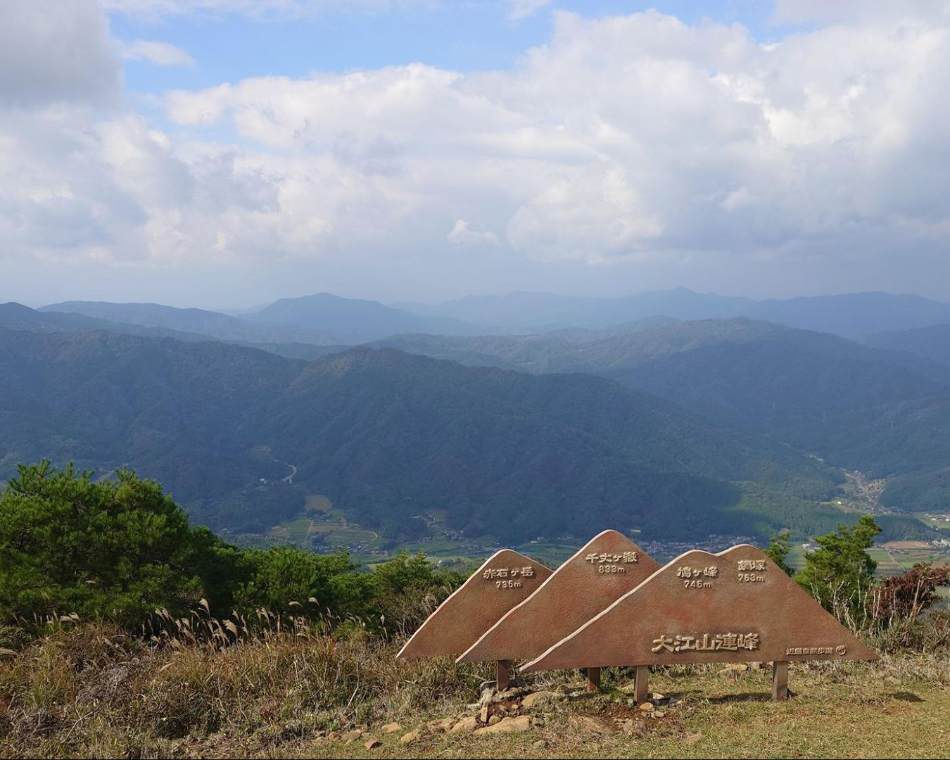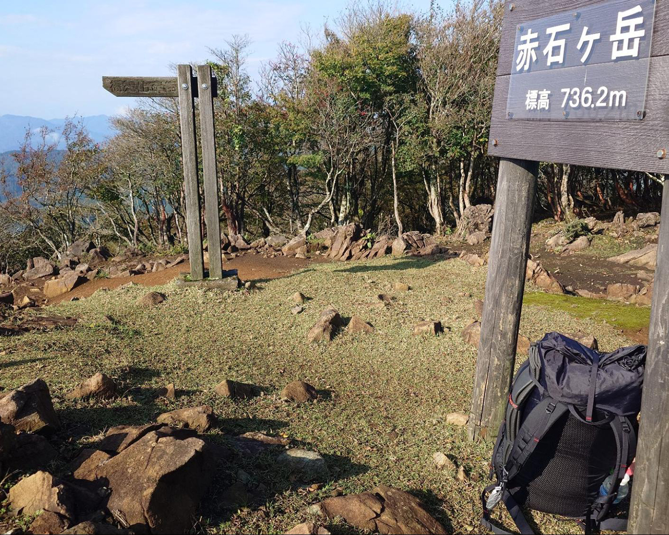 最初に登る赤石ヶ岳は「赤赤縦走路」と呼ばれる赤石ヶ岳から赤岩山を繋ぐ大江山連峰トレイルメインルートの出発地点だが、10月下旬の平日のためか登山者は誰もおらず。首都圏近郊エリアや有名な山域の混み具合に慣れてしまうと、寂しいぐらいであった。