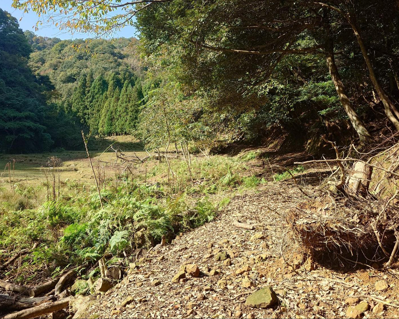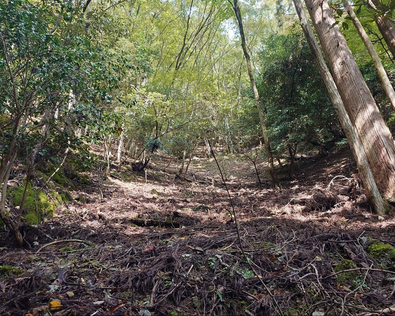京都と兵庫の県境付近で山道ルートに入ると、「本当にここなの?」という荒れ具合。後日、山陰海岸ジオパークトレイルのコースのガイドページを見たらタイトルがこれ。