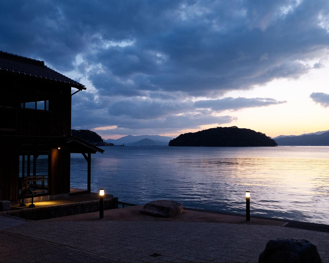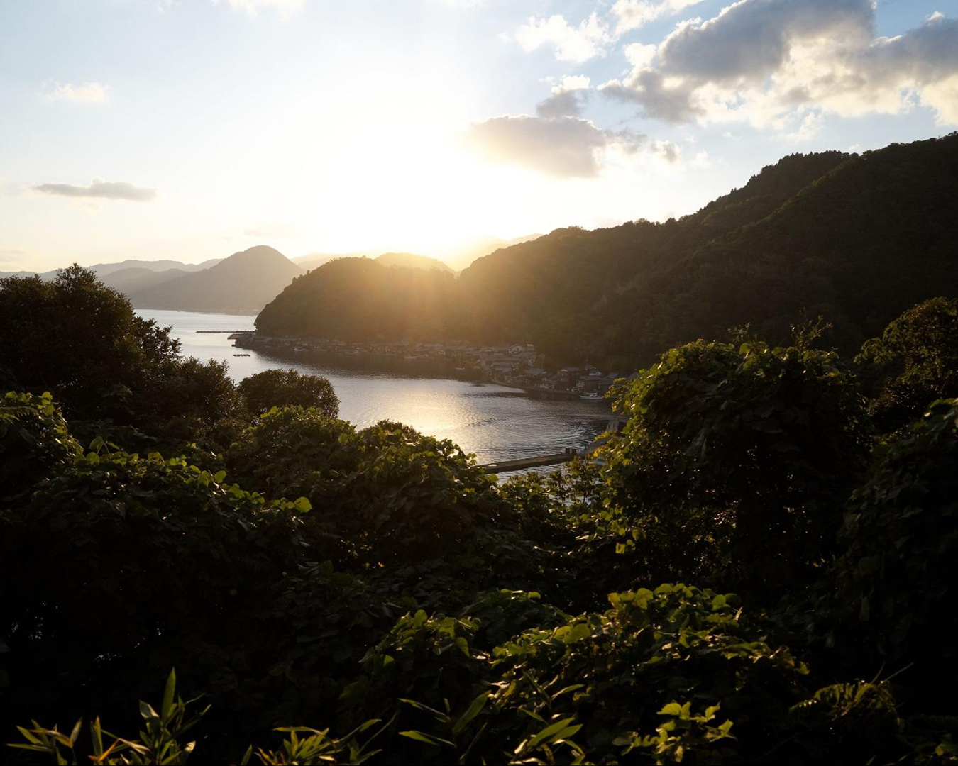 久美浜湾に沈んでいく夕暮れ時。水面は穏やかで波の音は聞こえず、静かな時間が流れる。