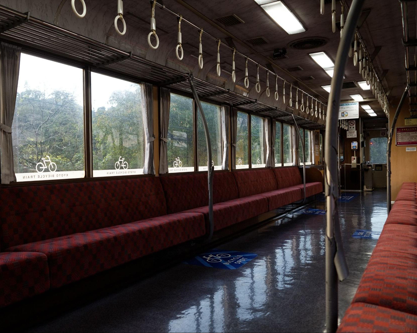 自転車を輪行袋に入れずそのまま置けるスペースがある京都丹後鉄道宮豊線。始発の電車内は乗車時無人だったが、下車する頃には通勤通学の人たちで席は埋まっていた。