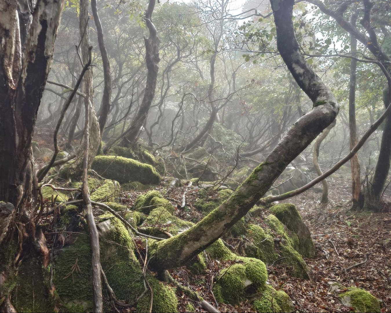 雨に濡れた苔むした岩と木の根が、ツルツルと滑る…。