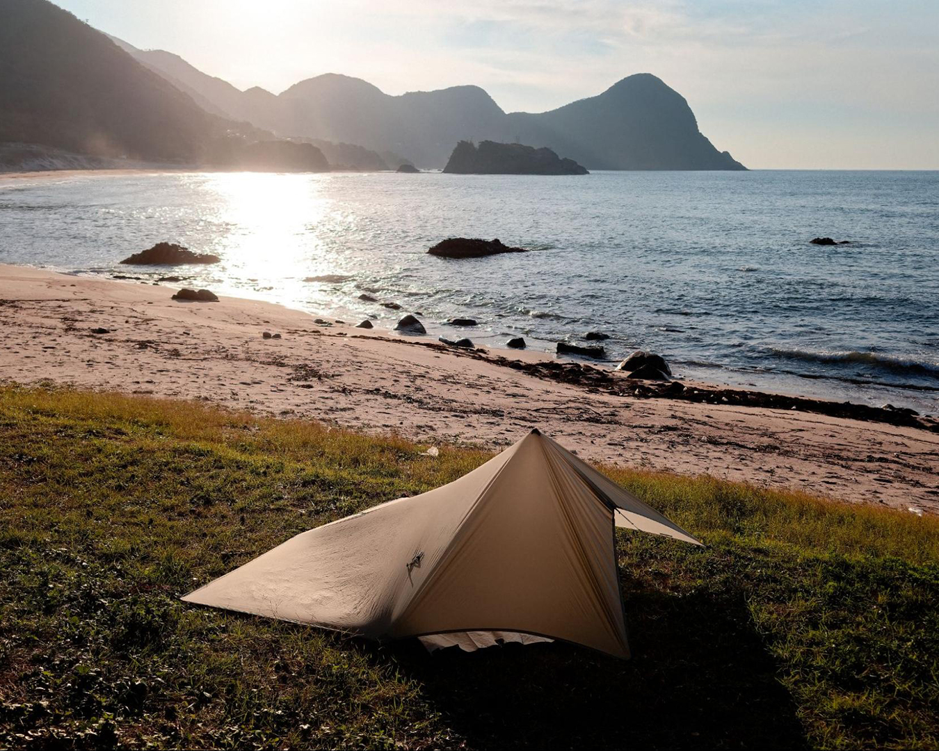 経ヶ岬は山陰海岸ジオパークトレイルの最終ゴール地だが、今回は逆行ルートのため半島北側に出てからは経ヶ岬、袖志の棚田などを経て、高嶋キャンプ場に辿り着いた。海辺のキャンプ場は他に誰もおらず貸切状態。ここもハンモックを吊るせる木がなかったため、タープ泊となった。