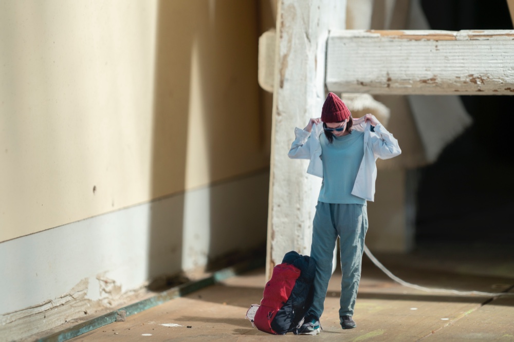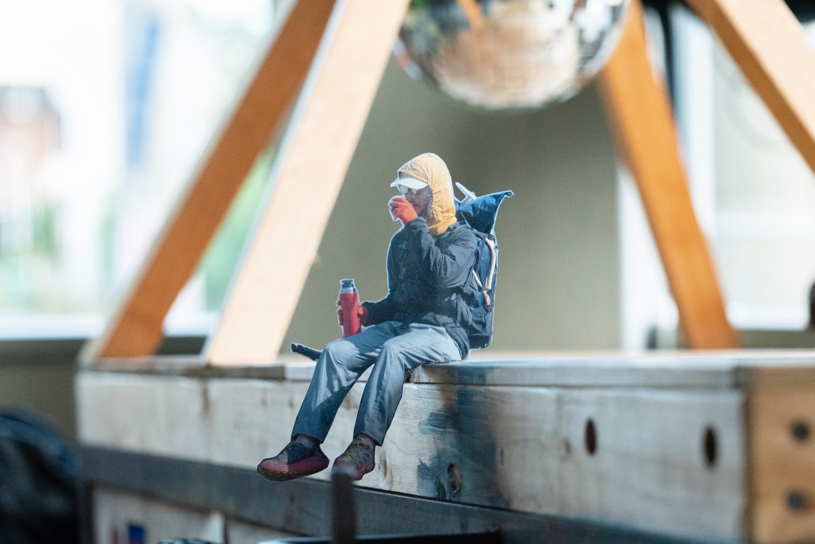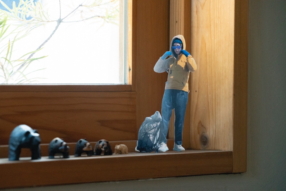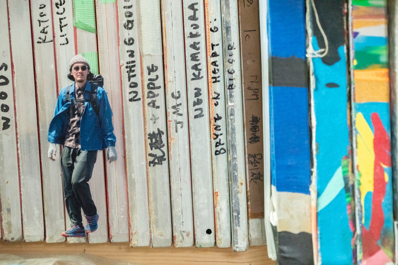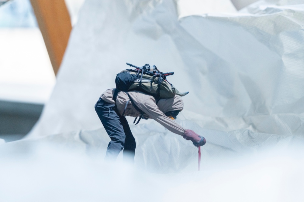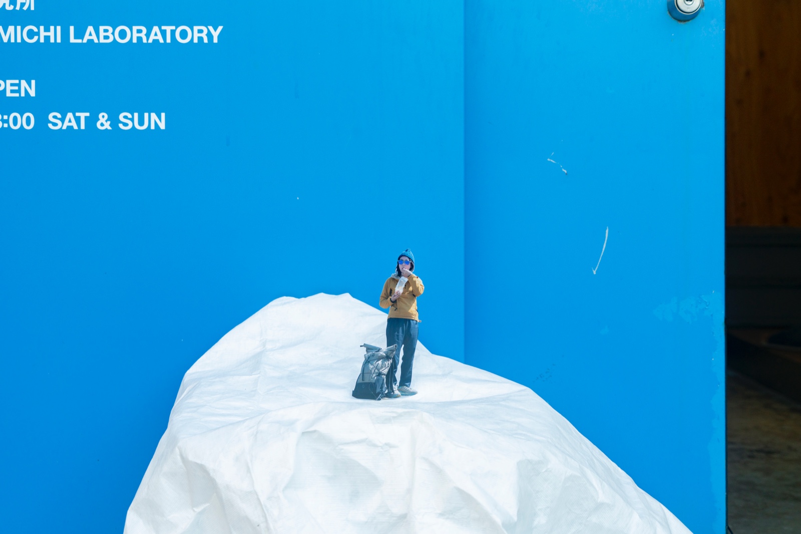 タイベックをしわくちゃにして凸凹を作ると雪山になった。影がまるで暴風の悪天候に見えた。青いドアは青空になり、木の什器や窓枠が山小屋になった。(夏目)