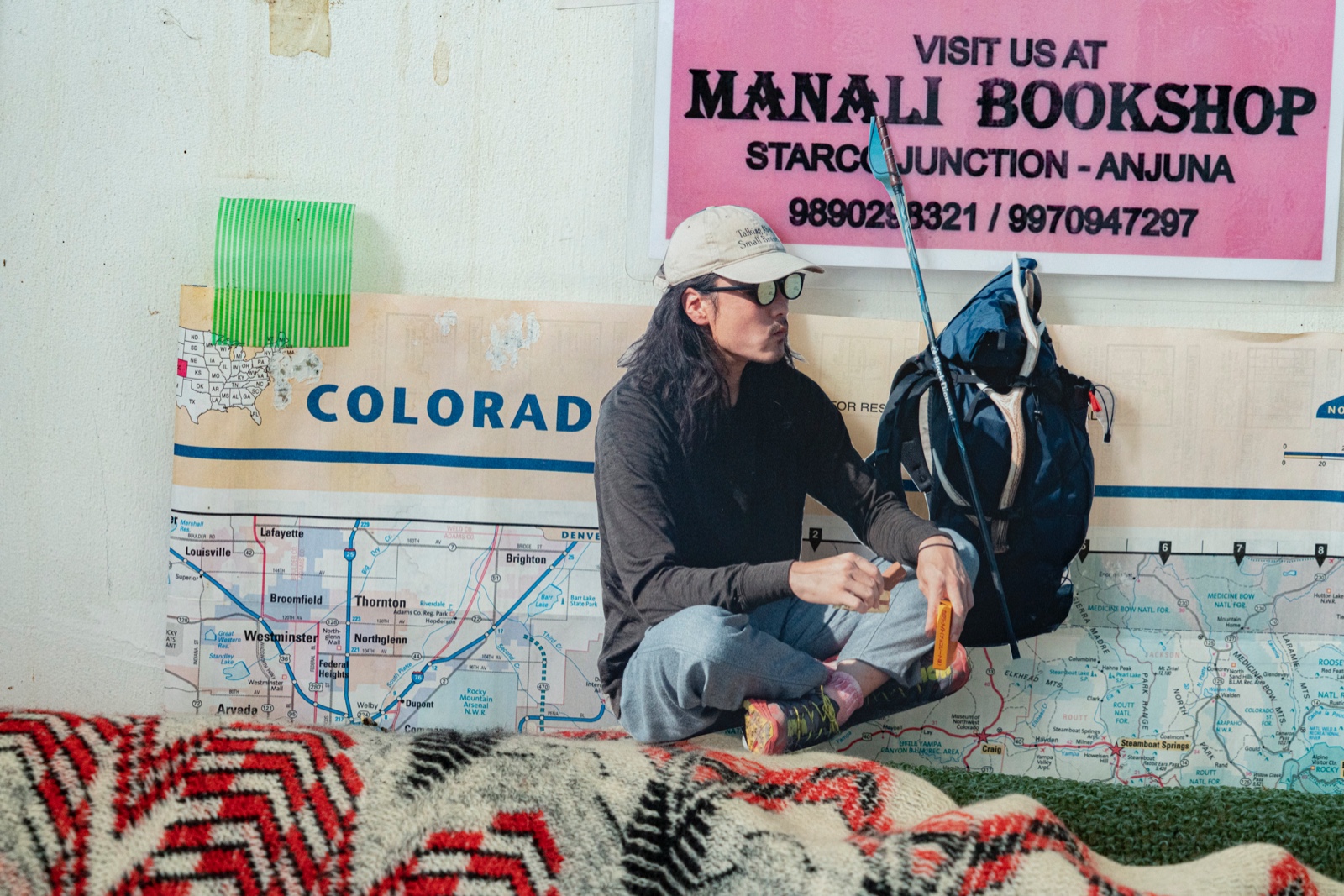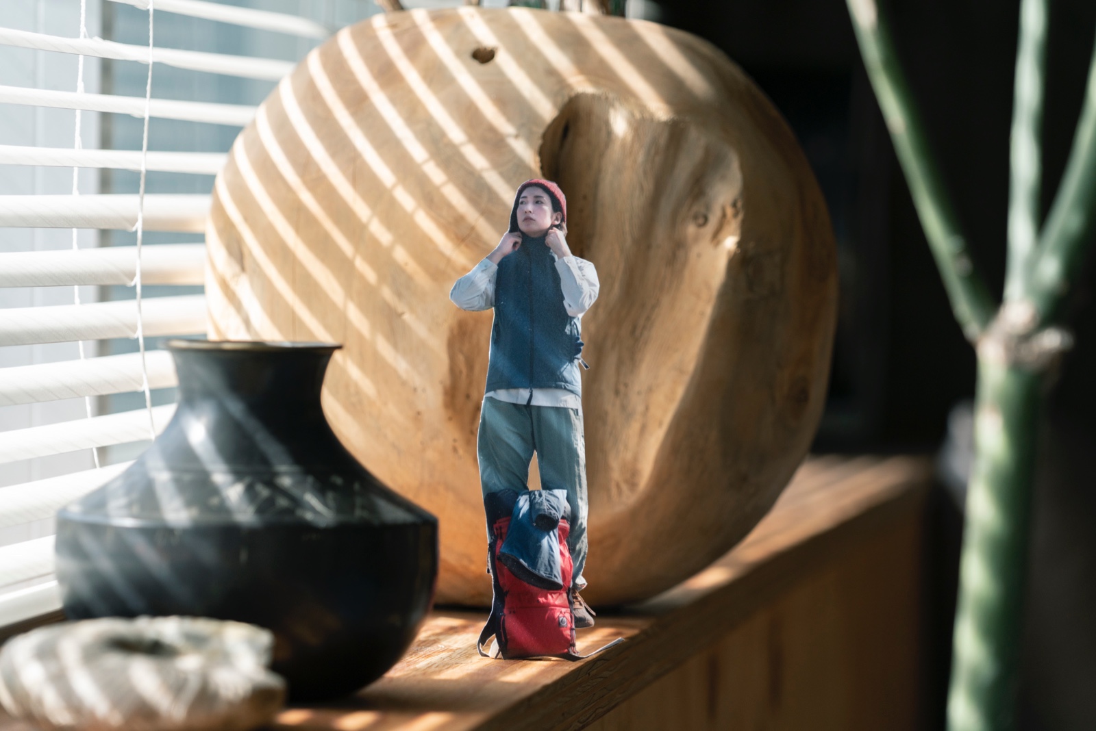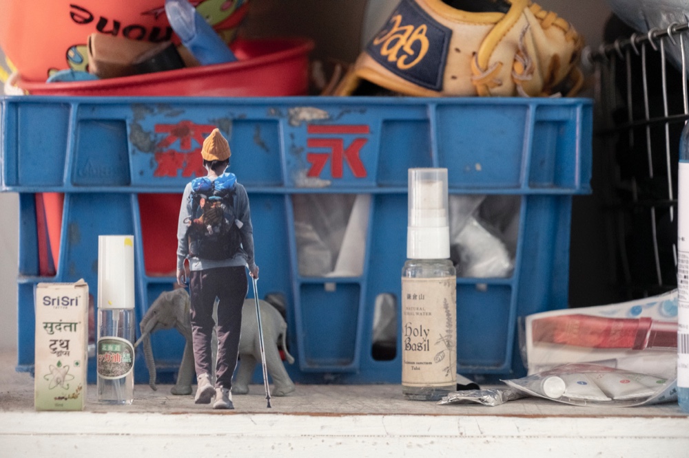そんな中、山や空の写真を大きくプリントして背景にしたり、プロジェクターで投影してその前で撮影する案など、夏目さんと案を出し合った。その後、コラージュ案に至った時に、切り抜いた写真を身の回りに置いて撮影する手法を思いついた。