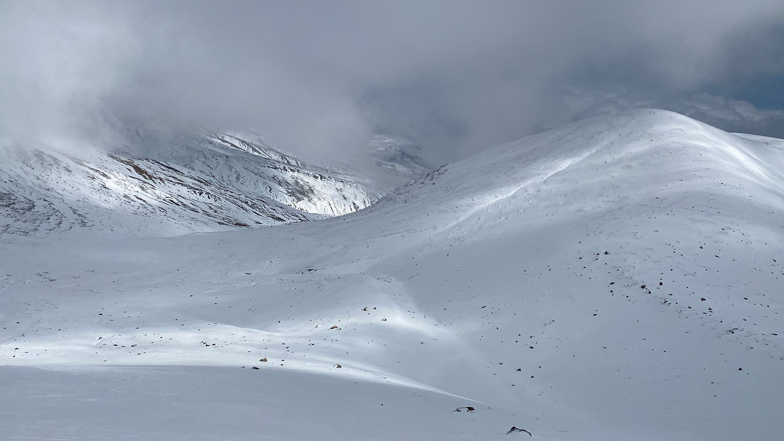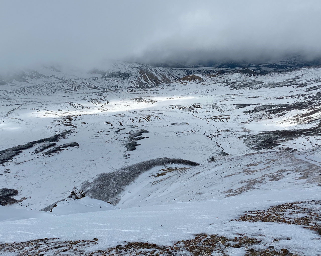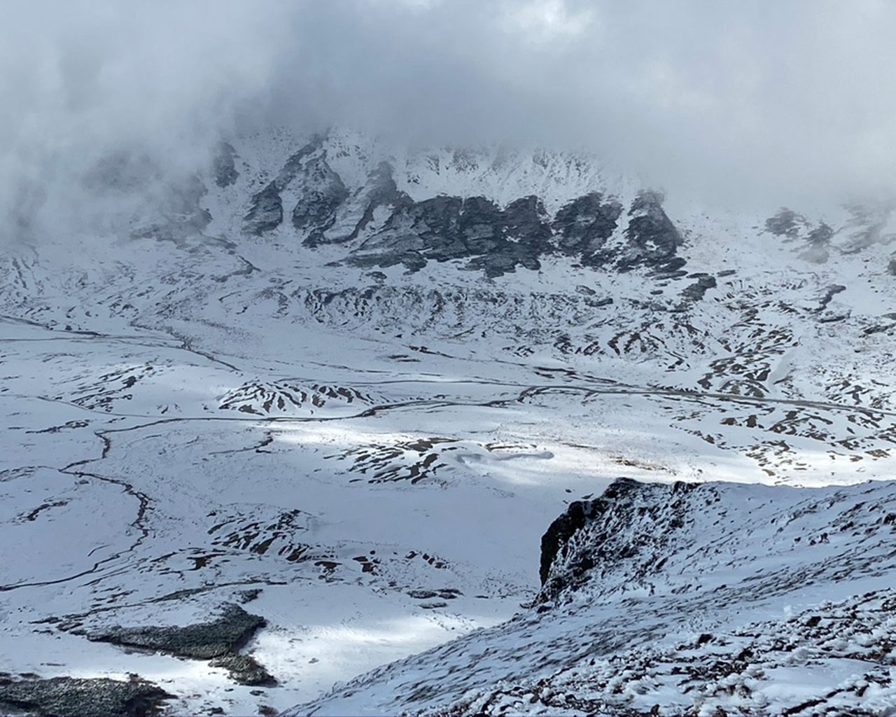 しばし見惚れていると、また雲に閉ざされてホワイトアウトに戻る。でも天気は回復に向かっていることを確信しほっとする。