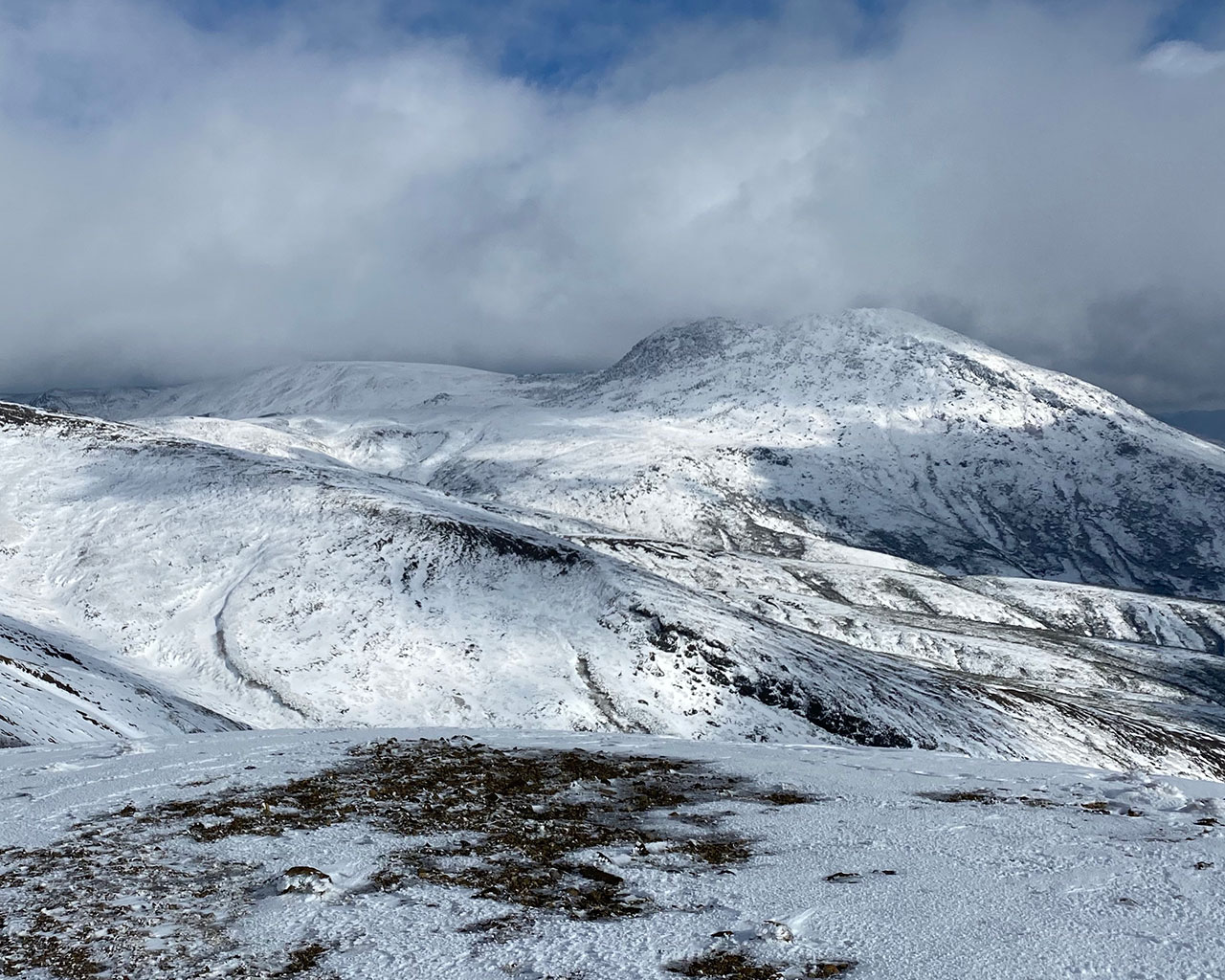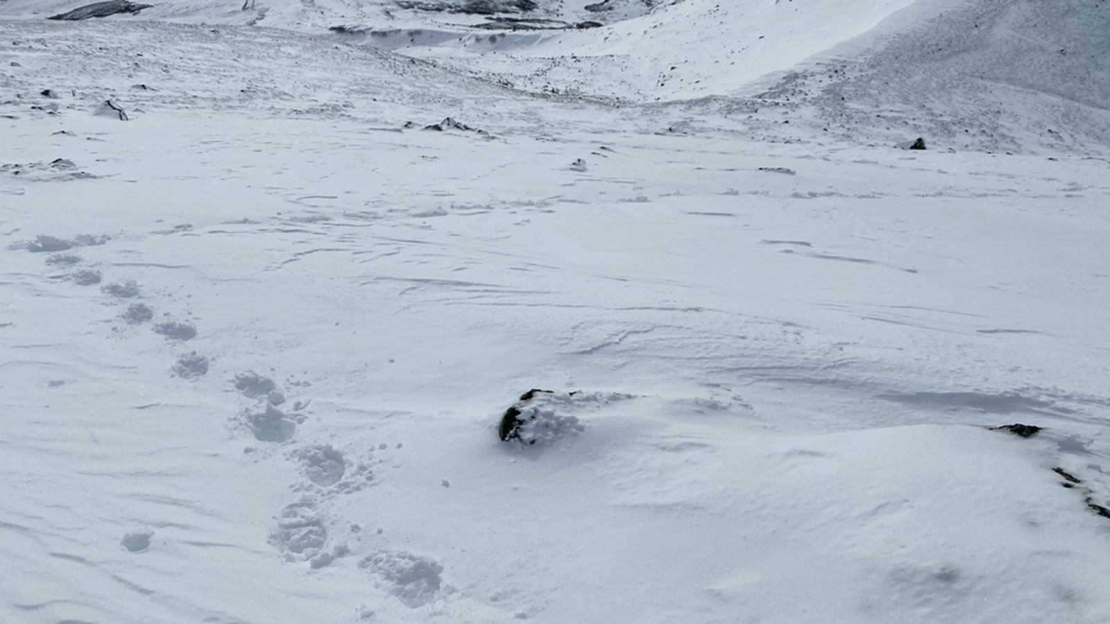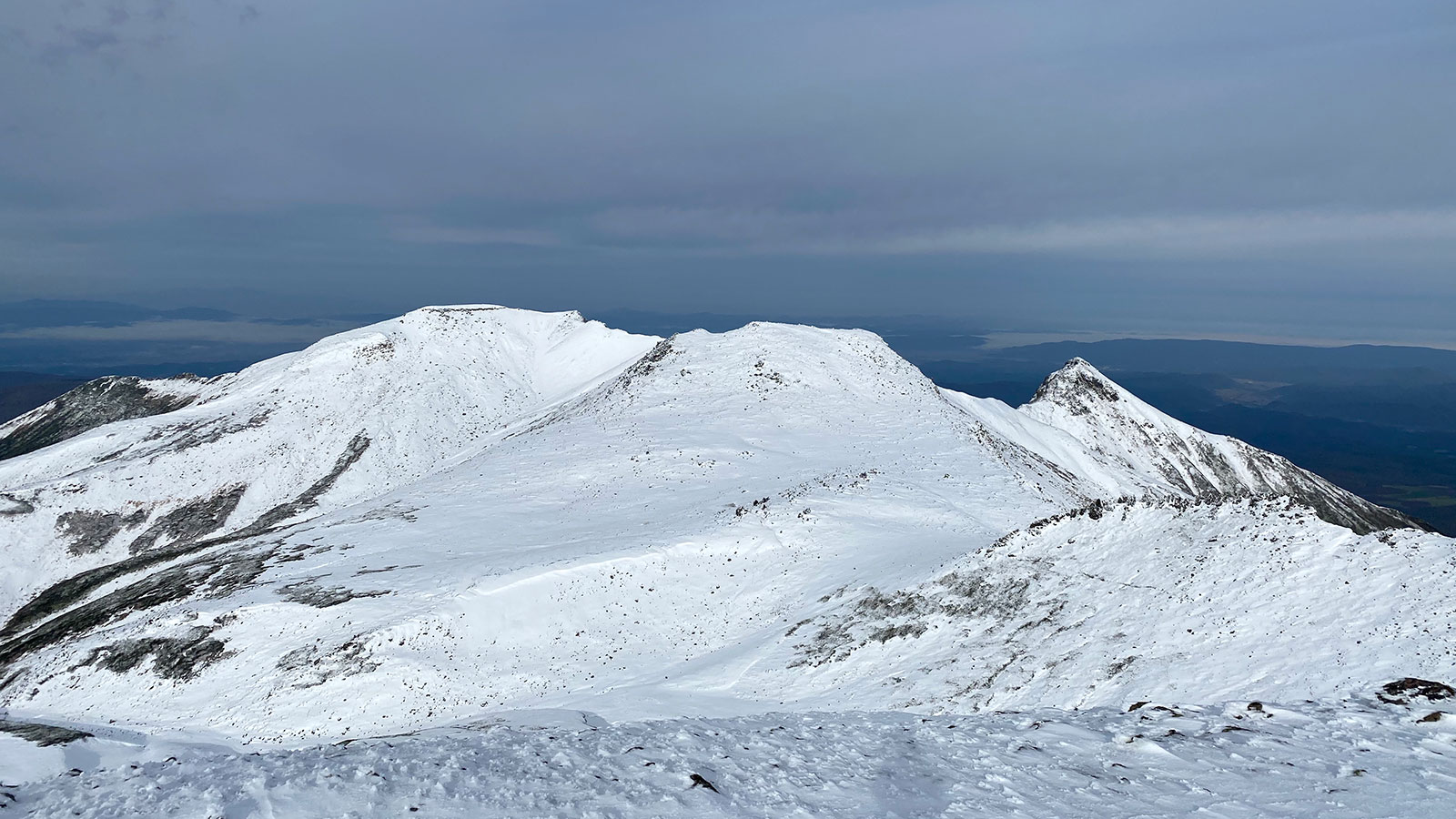 雪は締まっていて、歩きやすかったが、北海岳を越えた辺りから雪を踏み抜くことも多くなる。膝下は雪にまみれている状態だったが、メリノ5ポケットパンツ1枚で快調。正直普段はこんなシチュエーションならウインターハイクパンツを履いてくるので、メリノ5ポケットパンツでこんな雪山を楽しむのははじめての経験だった。「メリノ5ポケットパンツ…、お前の才能を舐めていたよ。ここまで優秀な子だったとは。」雪がついても中まで濡れてくるような感覚も無く、暴風性も良好。ウインターハイクパンツのように透湿防水素材ではないので、雪の中単独で長時間使い続けるには無理があるとは感じるが、予想以上に幅広いシチュエーションに対応できるパンツだと見直した。