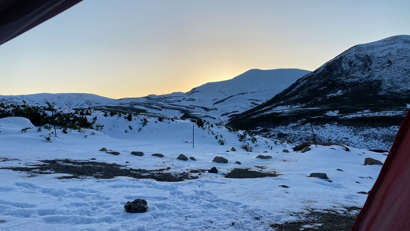 羽田の早朝出発で旭川空港に向かい、タクシーに乗り込む。途中の東川のモンベルで立ち寄り、燃料を買いながら山の情報収集。天場で水を汲めるか確認したが、凍結しているだろうとのこと。2日分の水を背負い、そのまま旭岳へと向かう。