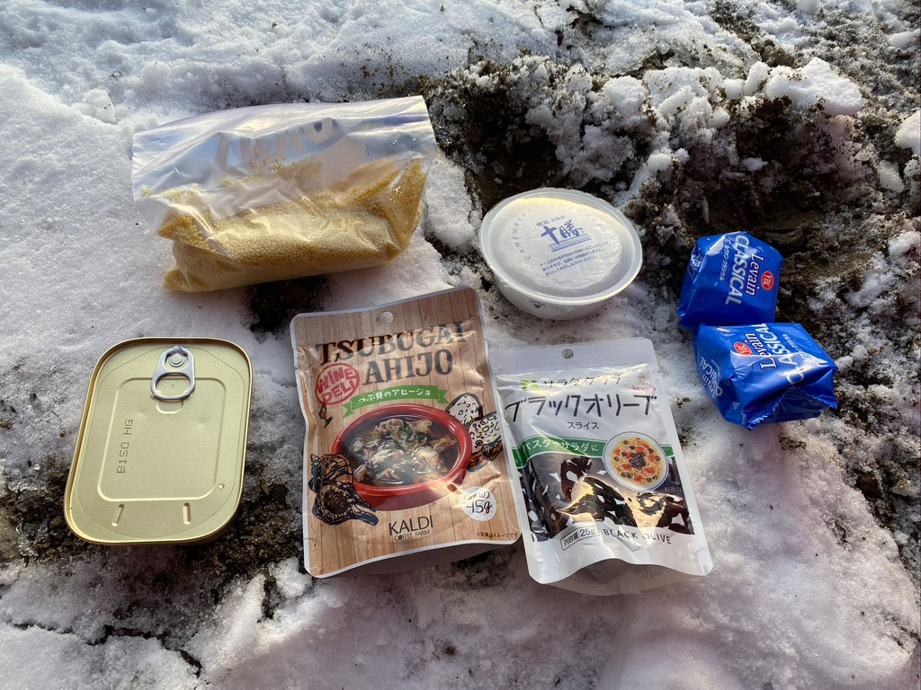 夕食はクスクスにオイルサーディンとつぶ貝のアヒージョを混ぜて、ブラックオリーブをトッピング。味付けに美味しい塩を少し足す。(レモンも持ってくるべきだった)あとチーズにクラッカーにポテトチップス。