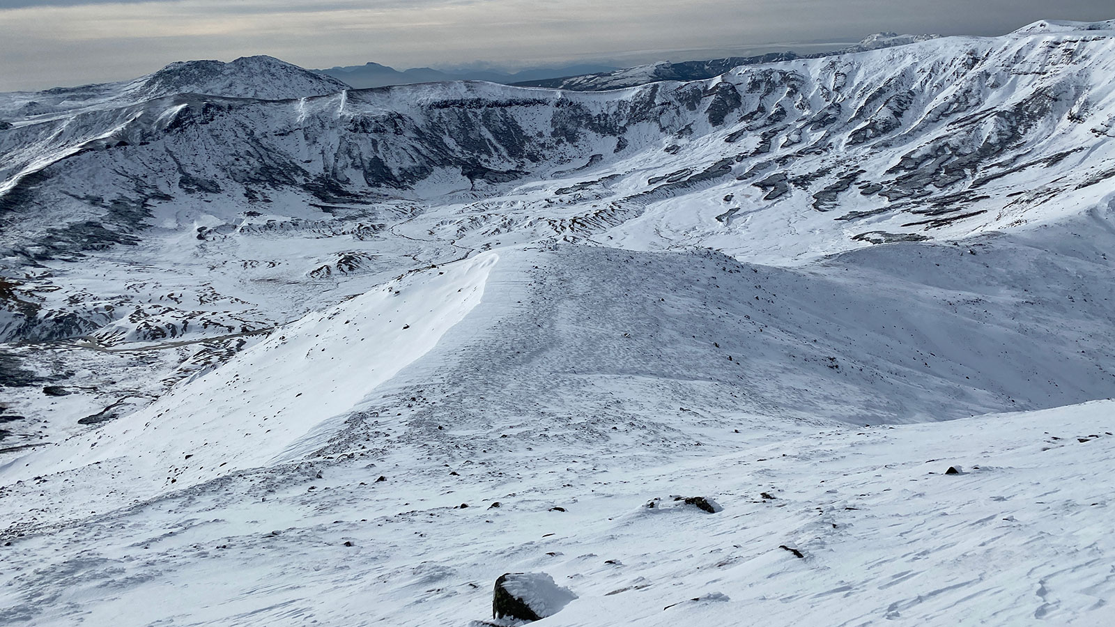 戻る途中、中岳温泉の野湯に浸かった。この雪の中でも温泉は湧き出ていて、冷水と暑い源泉が混ざり合い気持ち良い。誰もいないからゆっくりできた。