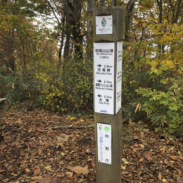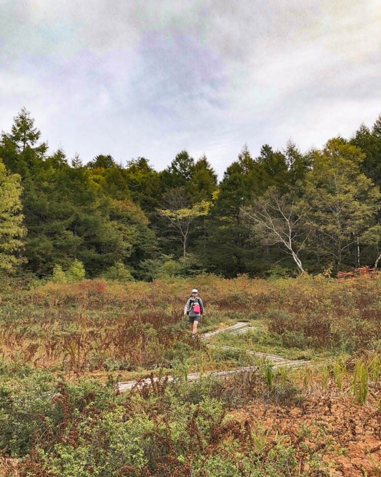 沼ノ原湿原を越えると、トレイルランナーにとってはレースで馴染み深い地名が標識に出てくる。紅葉もグッと深まってきた。フカフカのトレイルはさらに柔らかさを増し、より足に優しい。レースでは気持ちよく駆け抜けさせてもらったけれど、ゆっくりと踏みしめるように歩くのも悪くない。