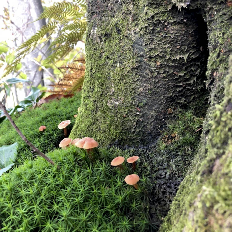 穏やかな日差しも相まって、天水山へのトレイルは優しく柔らかい雰囲気。平日のため、すれ違うハイカーもいない。苔やきのこがあちらこちらに生い茂り、「きゃー!たまらん」などと悶絶。落ち葉に覆われたフカフカのトレイルもとにかく気持ちがいい。