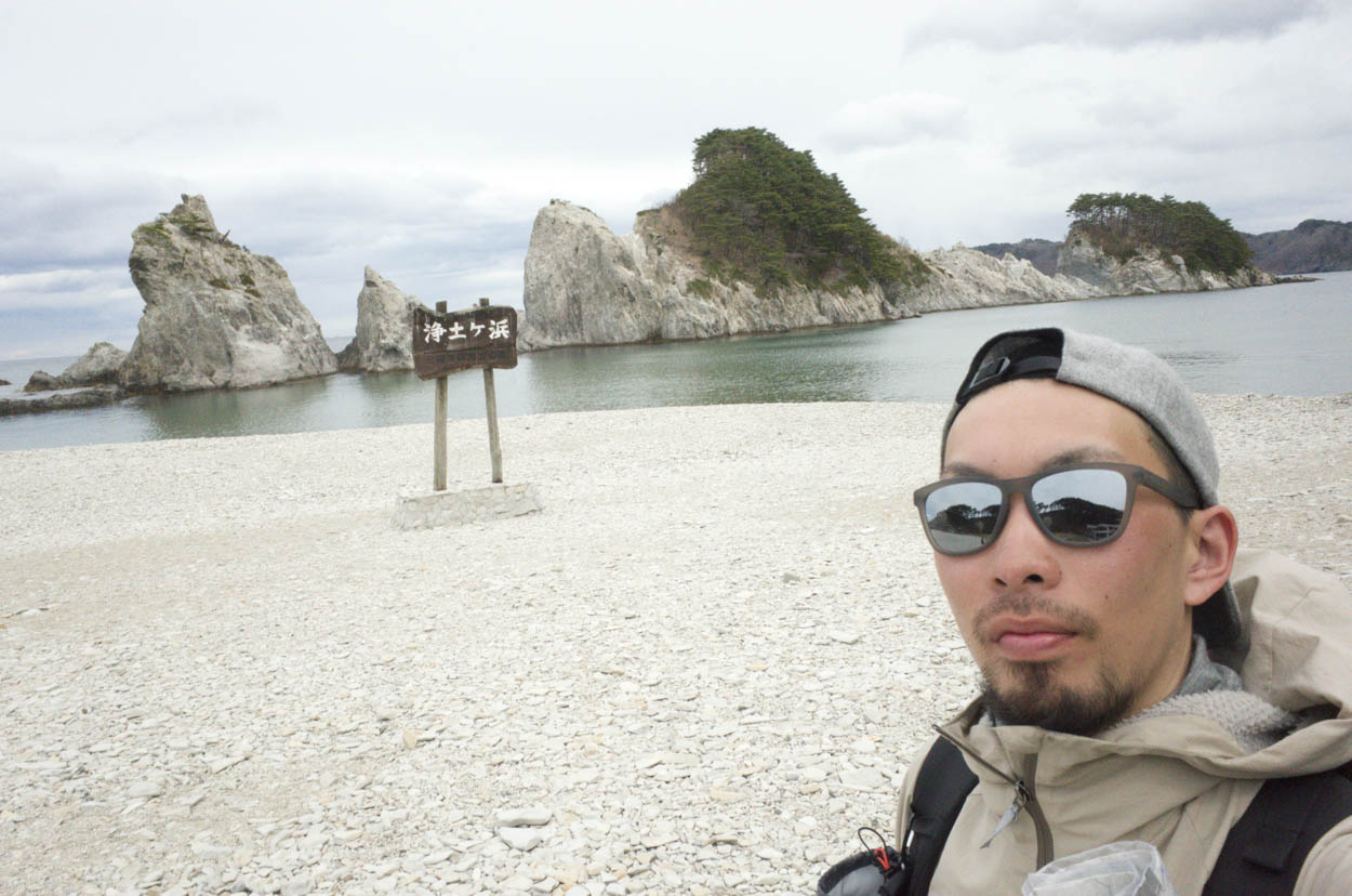 みちのく潮風トレイルDAY11。岩手県宮古市の景勝地浄土ヶ浜にて。 写真提供:武藤央展
