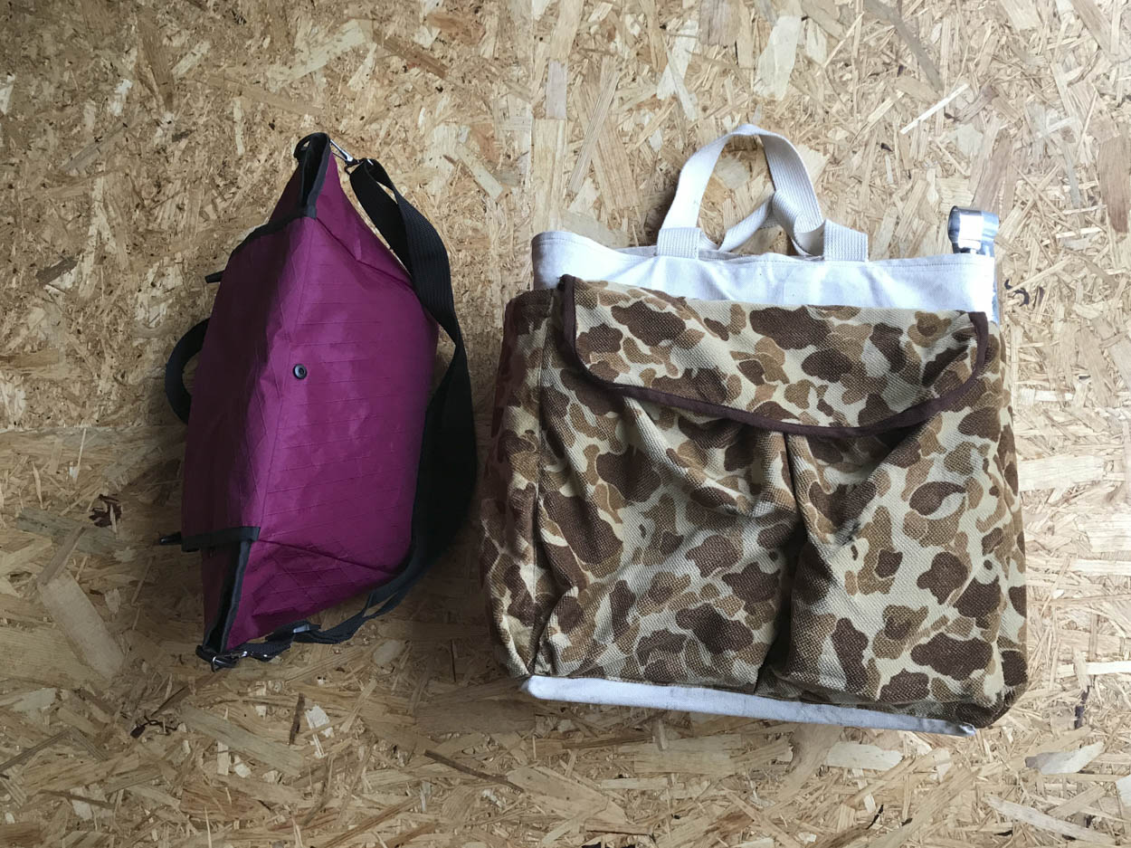 レジ袋有料化に伴い作成した買い物バック、UNIFLAMEの焚き火台がすっぽり入るトートバック。 以上4点の写真提供:武藤央展