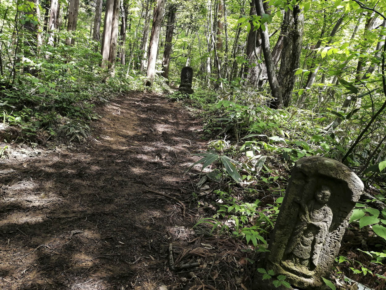 むとちゃんに話を聞いた後、筆者豊嶋も太平山の中岳へ。信仰の山らしい雰囲気が続く。6月初旬だったので新緑が美しい。