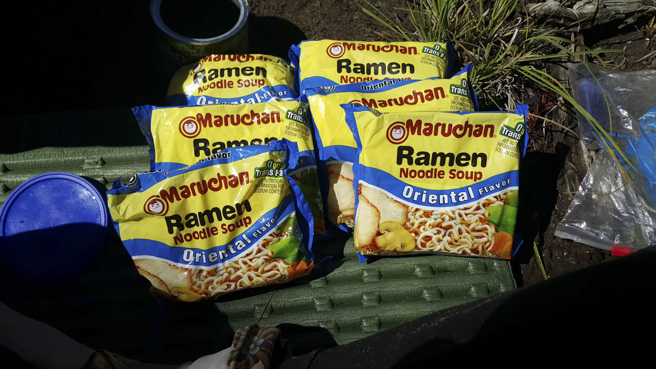 PCTを歩いた時は、兎にも角にも食費を安くすることだけを考えていた。アメリカのトレイルフードでいちばん安価なものは間違いなくインスタント袋麺の日清食品の『トップラーメン』と東洋水産の『マルちゃんラーメン』だ。どちらもアメリカ用に生産されていて、味も日本のものとは全然違い、チキンフレーバー、オリエンタルフレーバー、チリフレーバーなど味付けの種類も豊富だ。どちらかと言うと美味しくはないのだが、1袋が20円ほどで、かつどこでも買えて、軽い。資金が乏しいハイカーたちは馬鹿のひとつ覚えのように黙々とラーメンを食べ続ける。