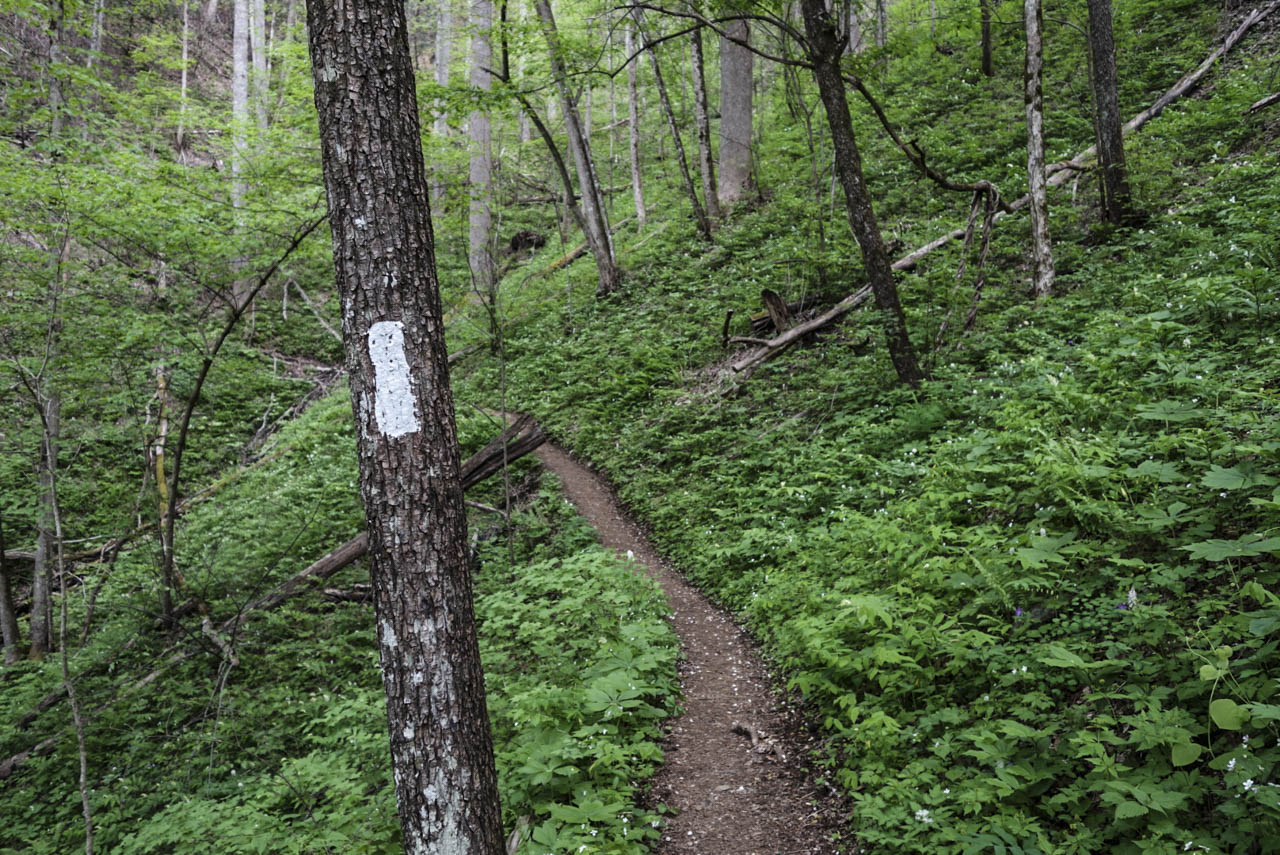 僕がグレートスモーキー国立公園に入ったのは1週間ほど前だった。トレイルは綺麗に整備されていて、所々飛び出している木の根にさえ注意すれば足元は全く快適である。整地された箇所以外は背の高い木々、そして地面は草花が生い茂っていて、どこを見ても緑色に囲まれている。