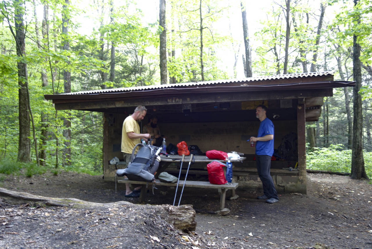アパラチアン・トレイルから脇に逸れるトレイルが現れる。脇道を3分ほど行くとテントが5、6張り立てられそうな広場が現れた。中央には焚き火をするためのファイヤーピット、そして少し離れたところに木造のシェルターが建っている。そして、中には既に3人のハイカーの先客がいた。シェルターは雨が防げることはもちろん、大抵水場が近く、トイレが併設されていることも多いので、昼頃にはハイカーが集まってくる。