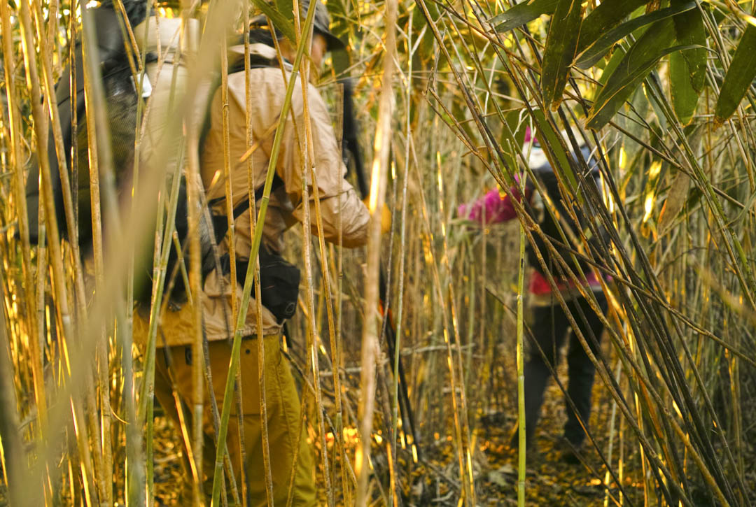 直前に水場があり豊富に水もあったので、どこでビバークすることになっても大丈夫なのでひとまず行こうとしてみたものの、スタートから笹ヤブが続いた。20分程ヤブ漕ぎして進んでみたものの、100m程度しか進まない始末。