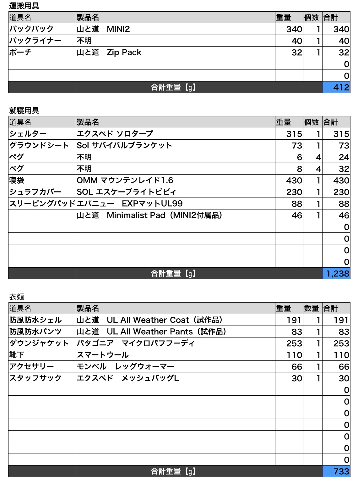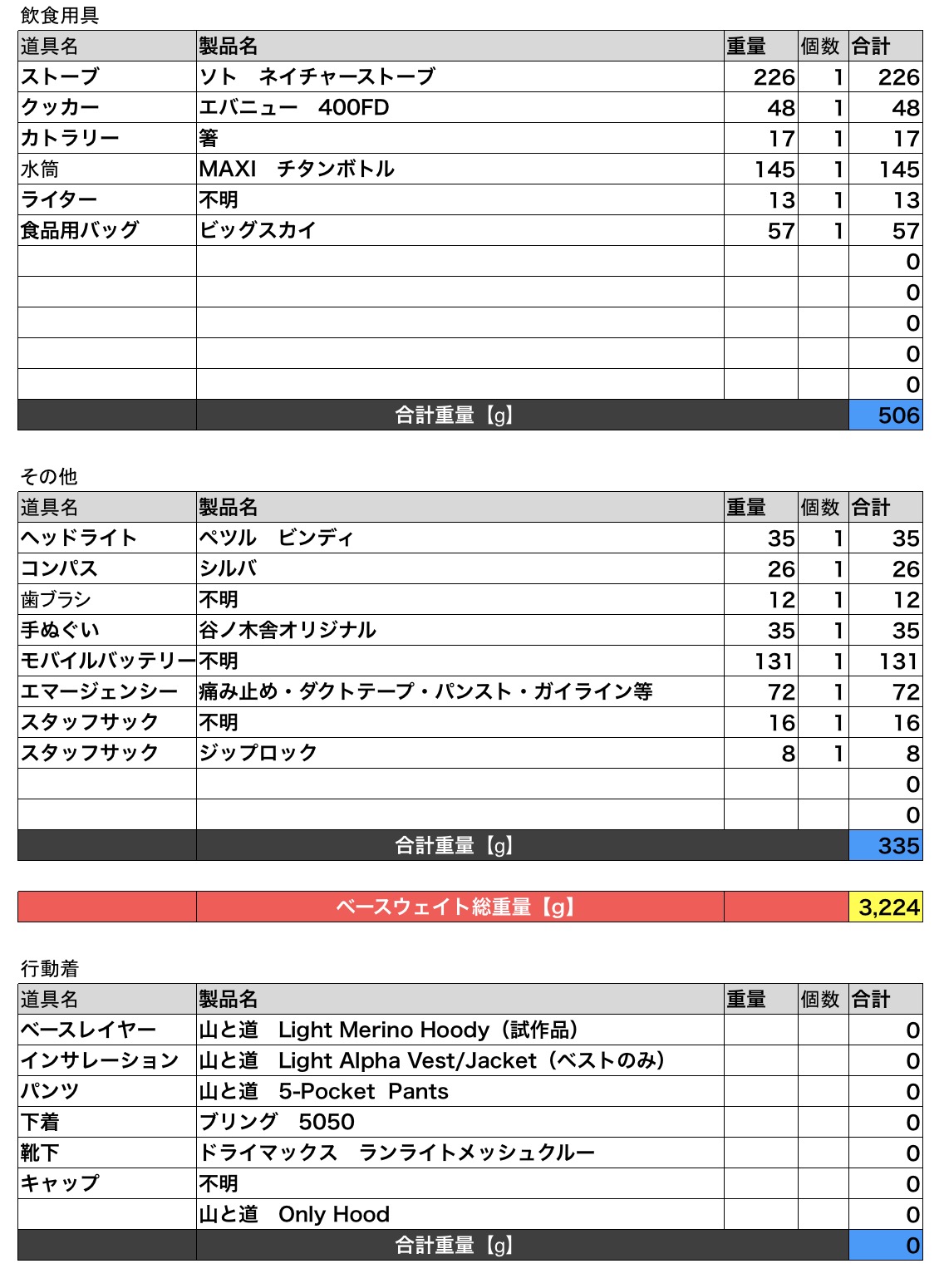 *ベースウェイトは食事・水・燃料などの消耗品を除く装備の重量です。