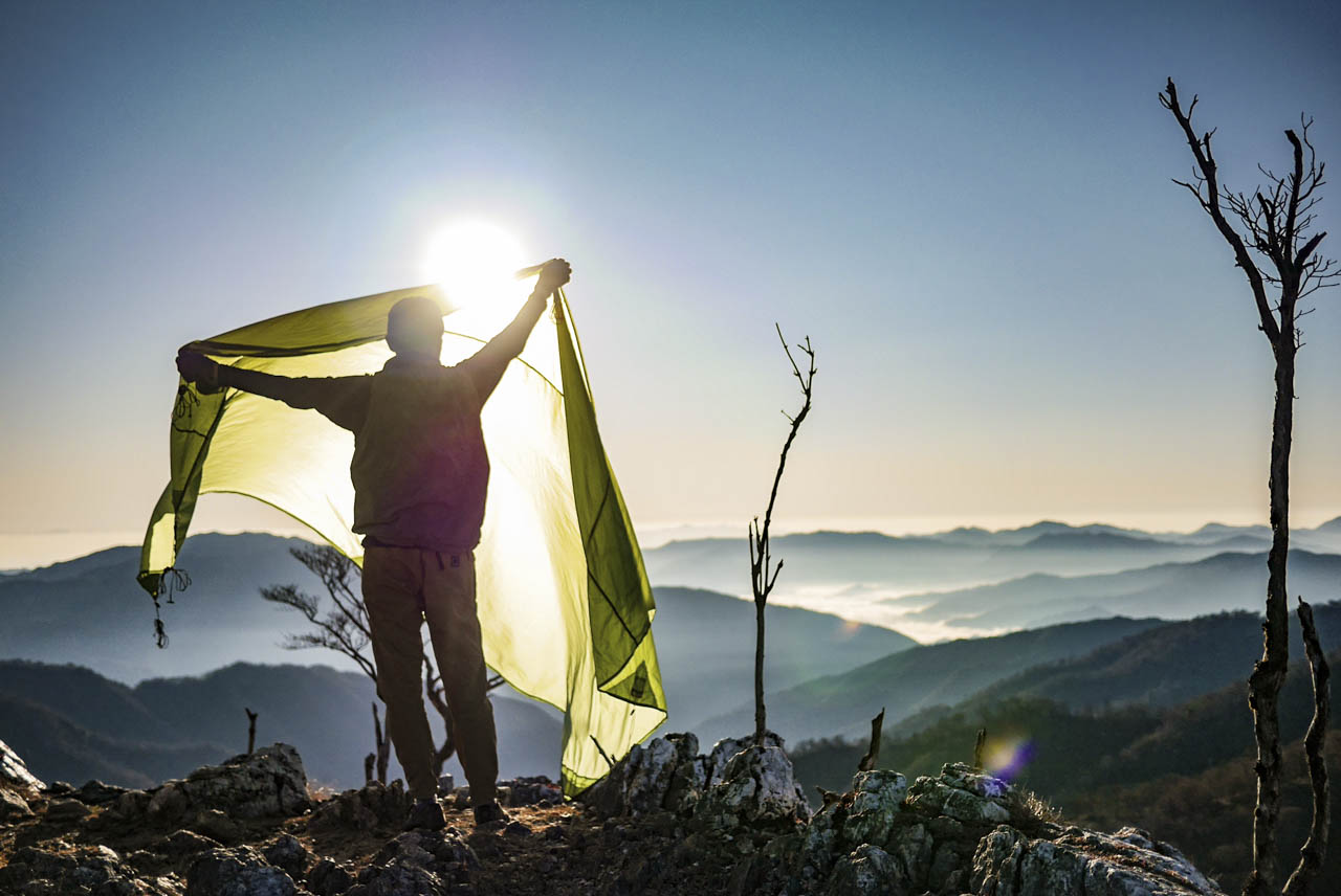 朝日を見ながら出発して、程なく脊梁山脈最高峰の国見岳(1739m)に到着した。山頂からは見晴らしもよく、歩いてきた霧島や大分県の九重連山、遠く長崎県の雲仙岳なども確認できた。あまりにも気持ち良かったので、夜露で濡れていたタープを干しながらしばらく休憩をとった。