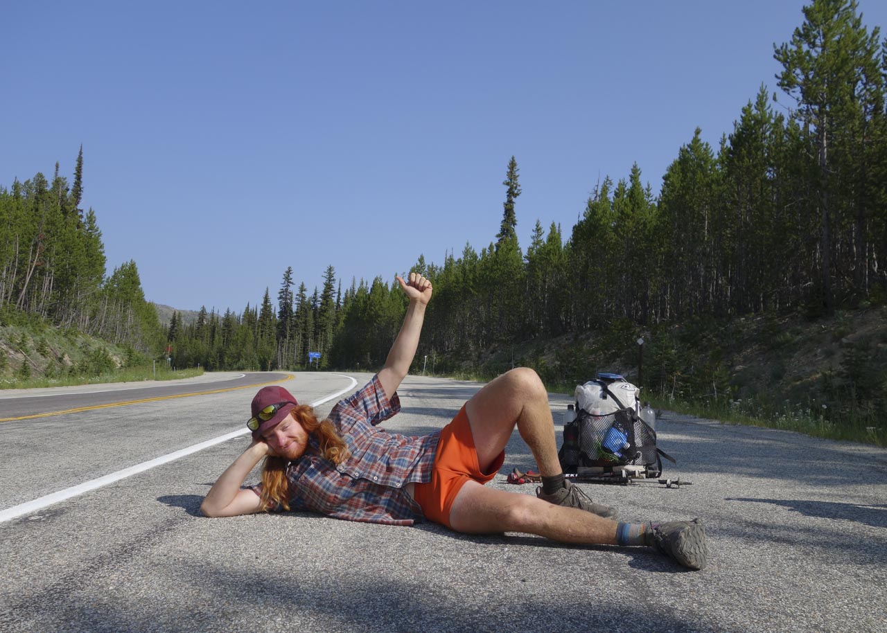 2017年にCDTをハイキングしていたシュウェップス。車があまりに来ないので、寝転がってヒッチハイクしている。