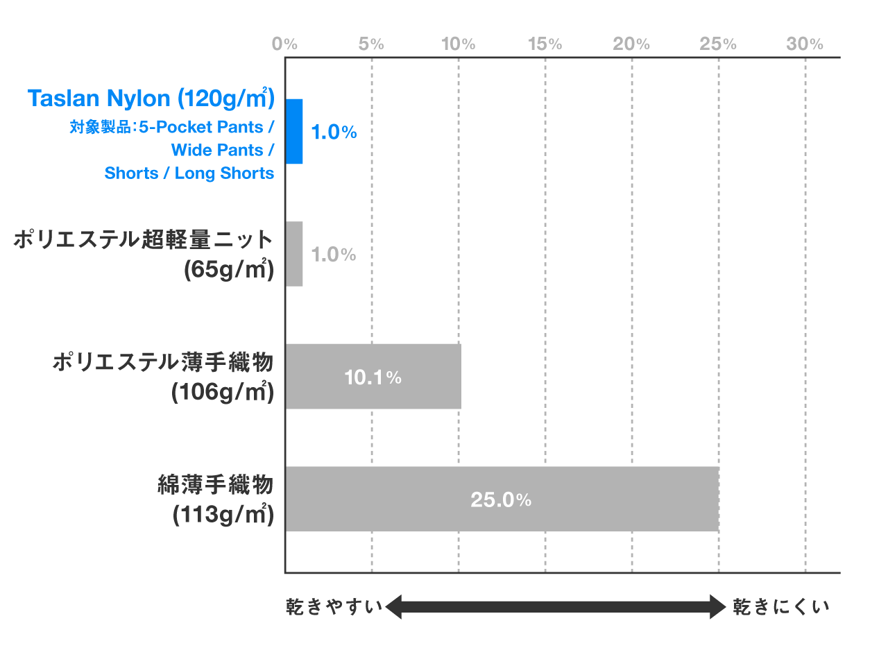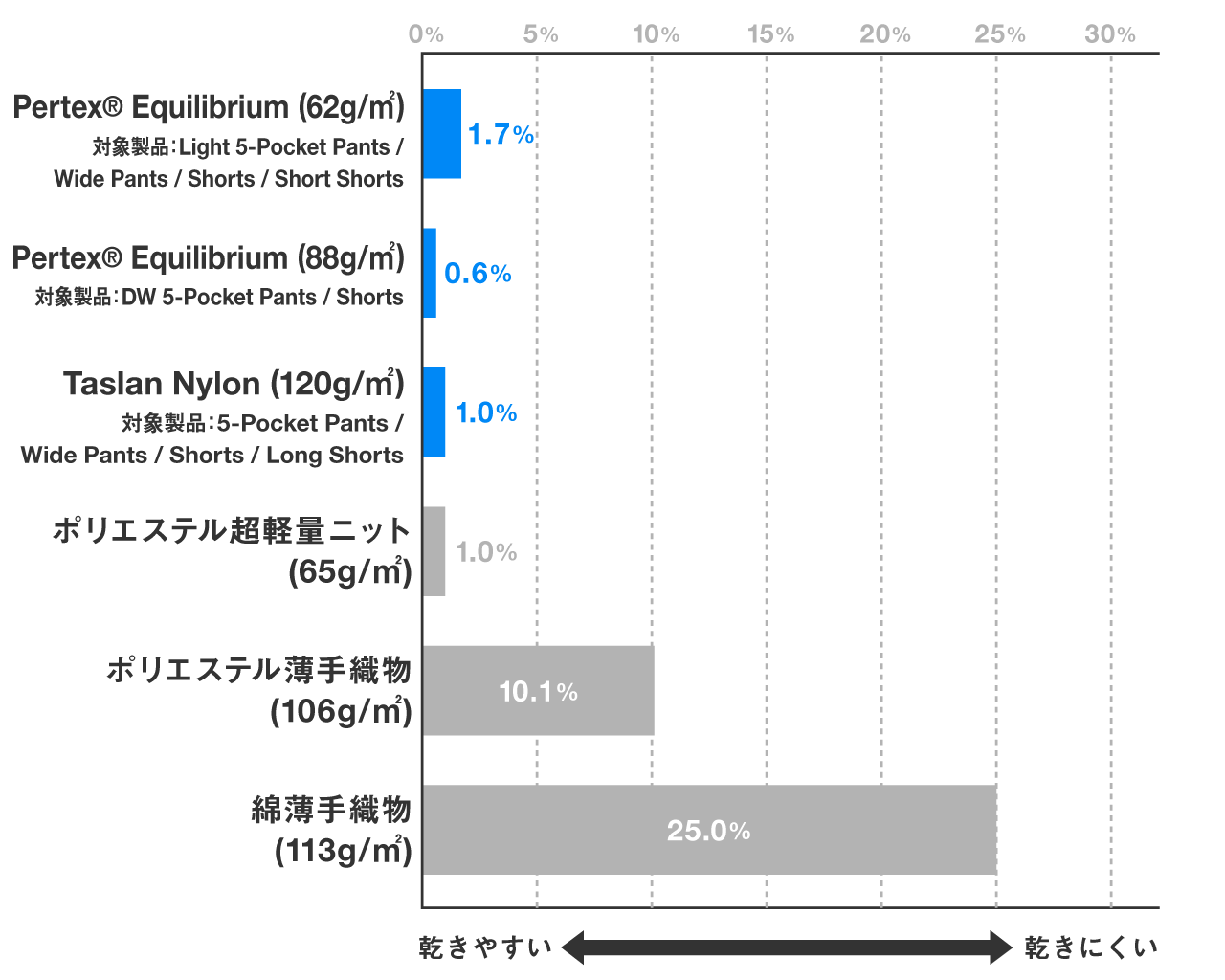 上図は5-Pocketシリーズ3製品と化学繊維のベースレイヤーや薄手の一般的なポリエステル、綿のシャツ等と脱水15分後の生地内の水分率を比較したものです。速乾性試験は水分率及び残留水分率を測定するテストを実施しています。水分率は低いほど速乾性が高く、3製品とも脱水15分後にはほぼ乾いていることが示されています。