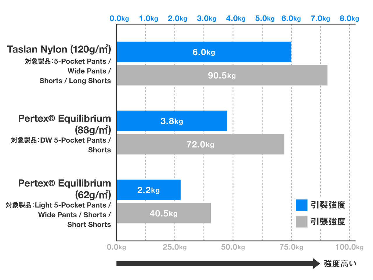 上図は5-Pocketシリーズ3製品それぞれの素材の引き裂きと引っ張りによる破断に対する強度を比較したものです。強度は素材の厚みに準じて5-Pocket Shorts / Pantsが最も高く、ついでDW 5-Pocket Shorts / Pants、薄手の素材であるLight 5-Pocket Shorts / Pantsはいちばん低い結果となっていますが、軽量性に富んでいるとも言えます。