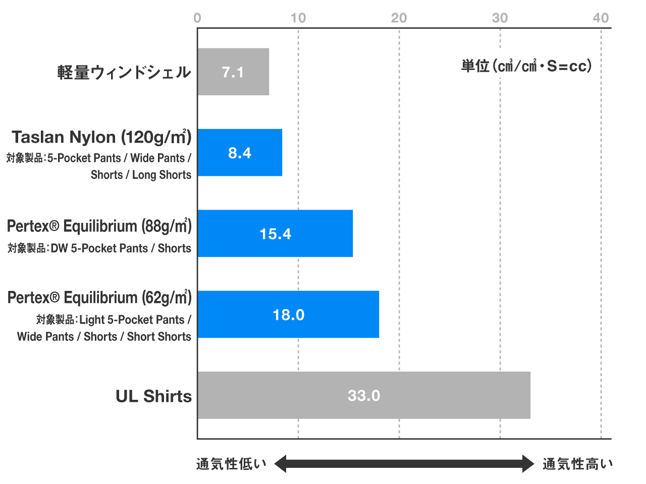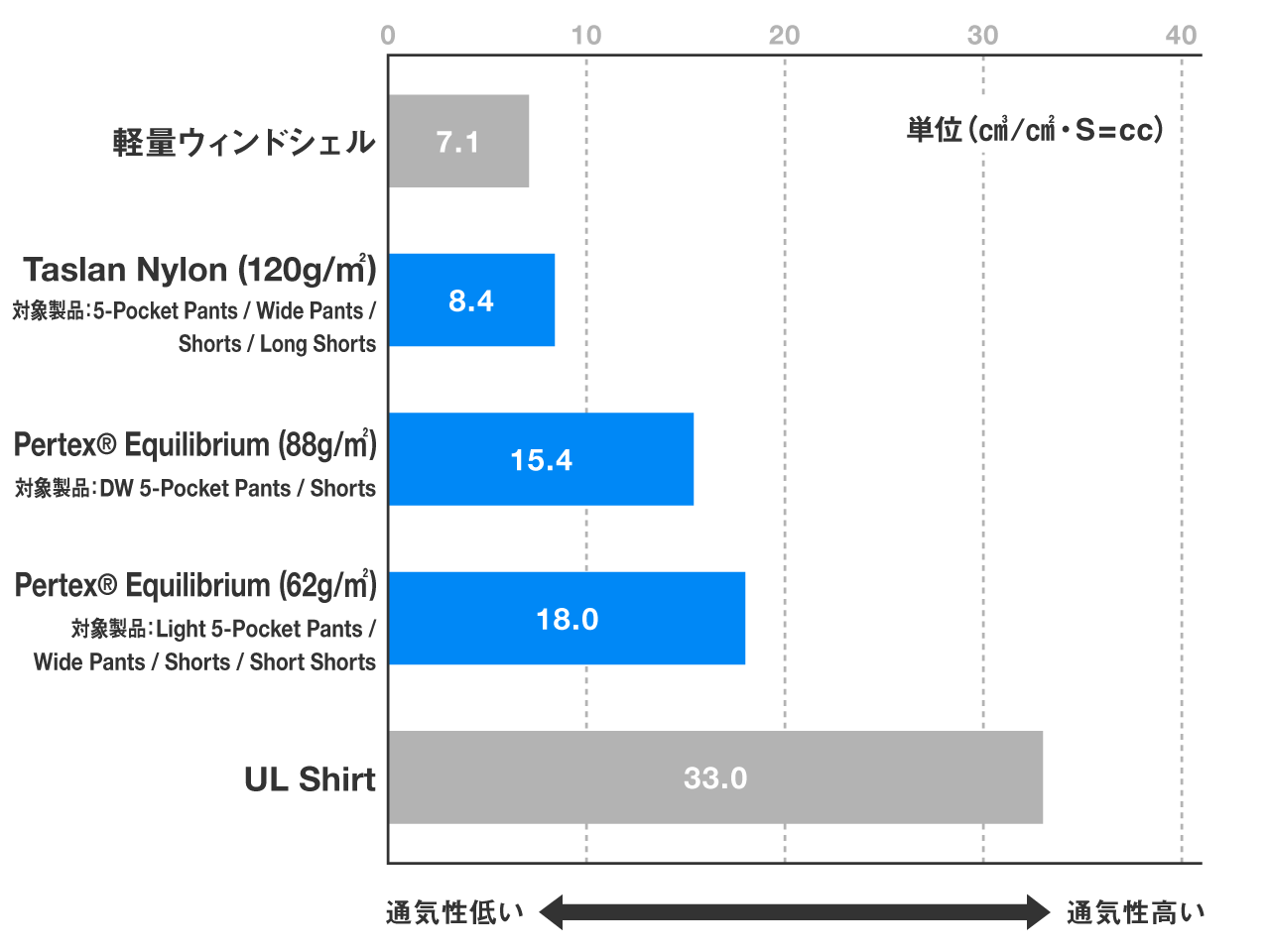 上図は5-Pocketシリーズ3製品と化学繊維の軽量ウィンドシェル、山と道のUL Shirtsの通気性能及び耐風性能を示したものです。