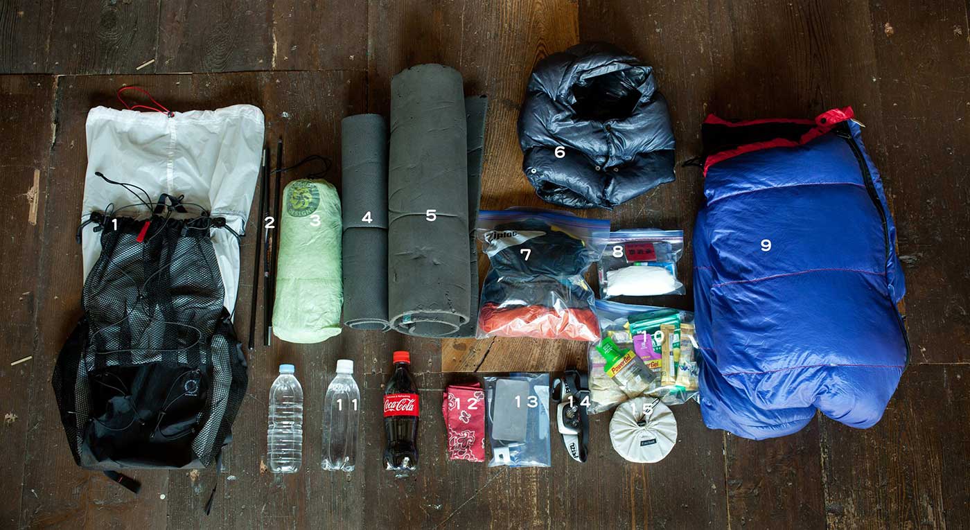 1.山と道MINI2/2.シェルター用カーボンポール/3.Six Moon Designs Deschutes CF(シェルター)/4.山と道Minimalist Pad(スリーピングパッド)/5.山と道UL Pad 15s(スリーピングパッド)/6.Highland Designs Down Food UDD(ダウンフード)/7.ウェア類/8.トイレセット/9.Highland Designs Down Bag(寝袋)/10.食料/11.500ccペットボトルx3(水筒)/12.バンダナ/13.予備バッテリー等/14.Petzl Tikka RXP(ヘッドライト)/15.Ifyouhave Pound Cup(クッカー)+固形燃料ストーブ