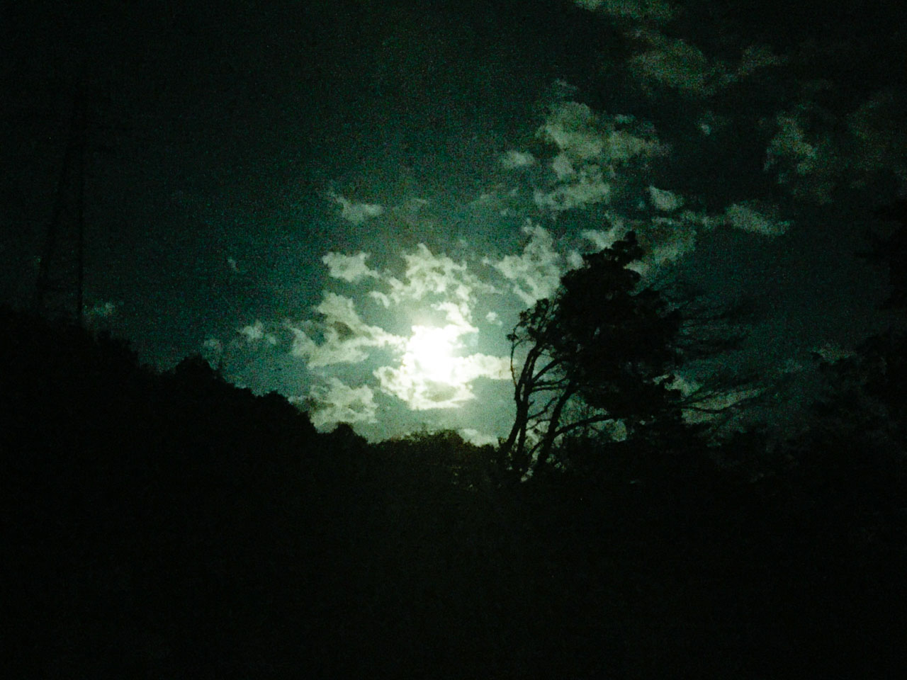 ある程度戻ったところで、間違えた場所を見つけた。昼間なら気がついただろうけど、暗いなか道なりに歩いていて間違えたらしい。低山では林道と電線の保全道が混在した場所が多いので注意が必要だ。仕切り直してぐんぐんと登っていく。木々の間にときどき見える満月がとても美しかった。