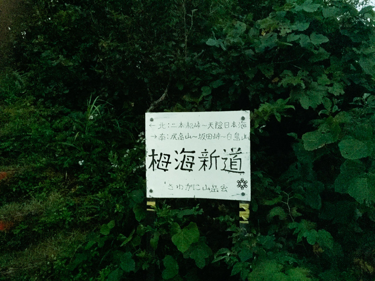 栂海山荘までは海から伸びる低山のような雰囲気が続くけど、栂海山荘を越えると稜線に出て、一気に高度感が出てくる。晴れていればここで朝日岳が見渡せて、北アルプスの勇姿がどんと視界に入ってくるのだが、今回は雲に覆われていて勇姿は拝むことができなかった。