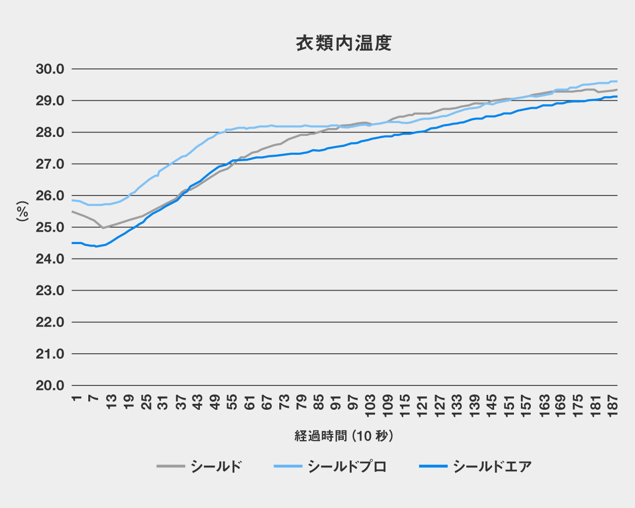 エアコンの設定は18度に保たれていたが、実験開始時点の衣類内温度にはわずかに差異があった。時間経過とともに3者とも温度は上昇し、シールドエアが29.1度、シールドが29.4度、最終的にはシールドプロが29.6度に達した。シールドエアとシールドプロの差異は0.5度であった。シールドエアはほぼ一貫して低い温度を保ち、より薄い素材のシールドよりも低温であった。