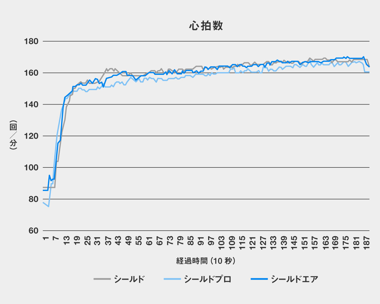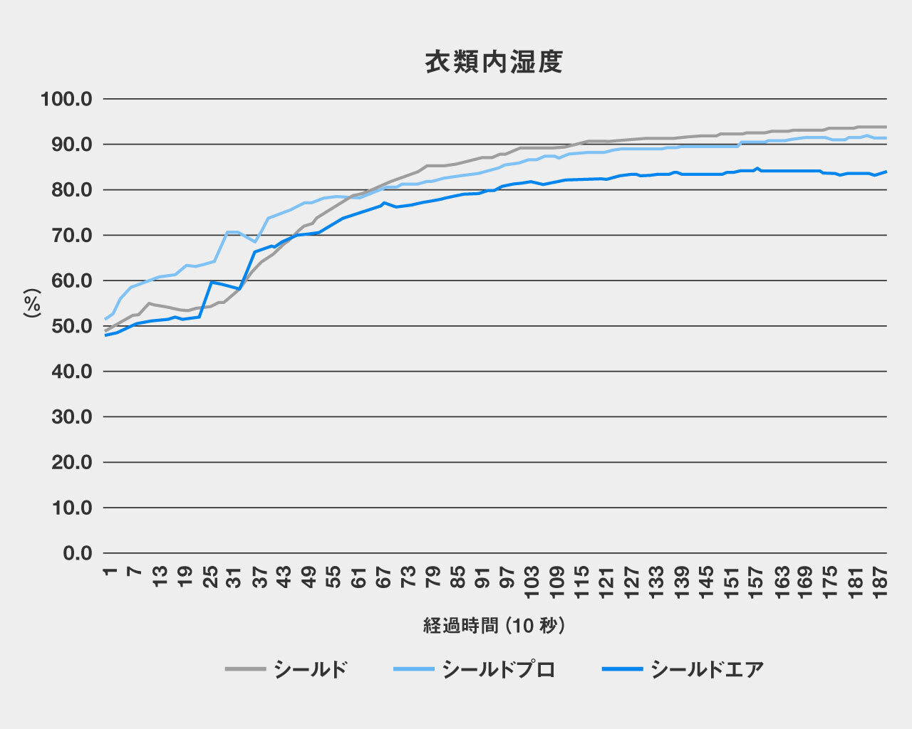 蒸れを感じ始める湿度80%を超えたのは、シールドが10分20秒後、シールドプロが10分40秒後、対してシールドエアは15分20秒後であった。