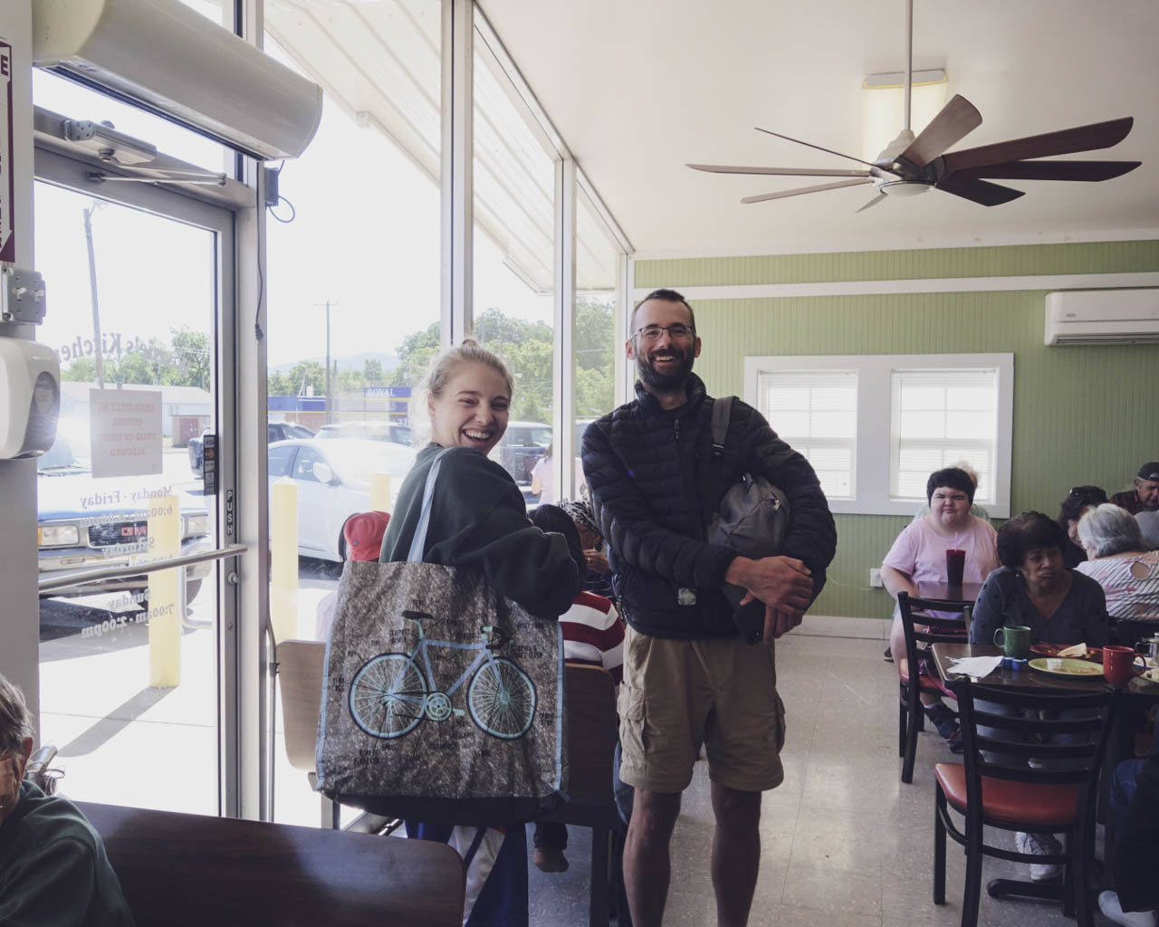 やっと辿り着いたバーガーショップでにこやかに笑う。