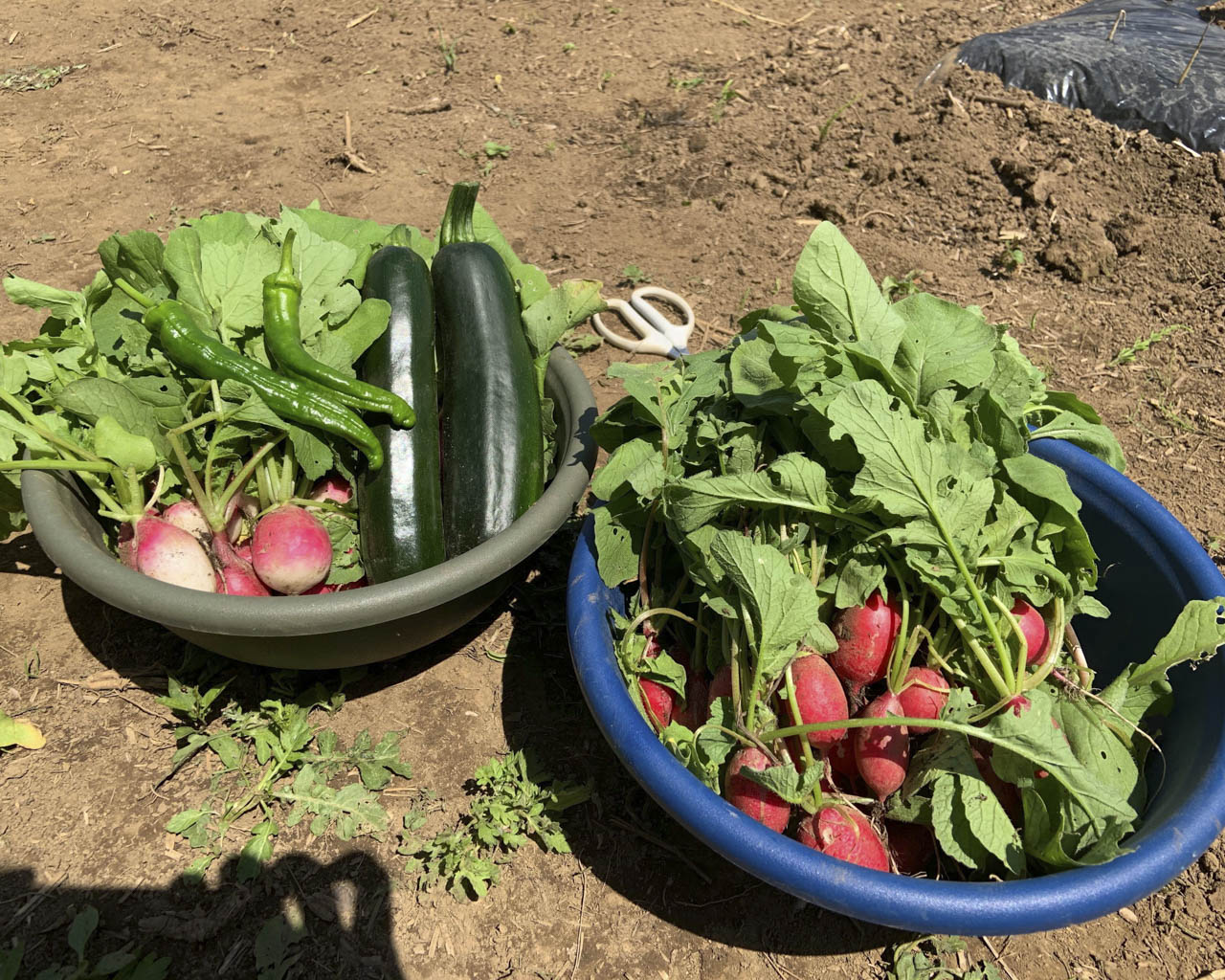 サトイモ、ズッキーニ、ツルムラサキとか、とりあえず友達が調達してきた苗を植えました。畑で作業していると友達や知り合いが前を通りがかったりとか、わざわざ遊びに来てくれたりとかするんです。