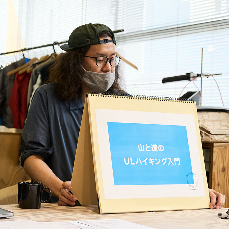 まずは山と道スタッフのキムさんとJKさんからウルトラライトハイクとは何か? という説明を紙芝居形式で受ける。おふたりの名掛け合いで楽しくわかりやすい解説だ。ULハイクにおいて「量る、選ぶ、替える」ということの重要性やベースウェイトの目安など、思わず「なるほど」と口からこぼれる。ただキムさんの汗がすごい。代謝がいいのか、緊張されているのか。紙芝居はどんどん捲られてゆくが、私は汗だくのキムさんから目が離せないでいた。
