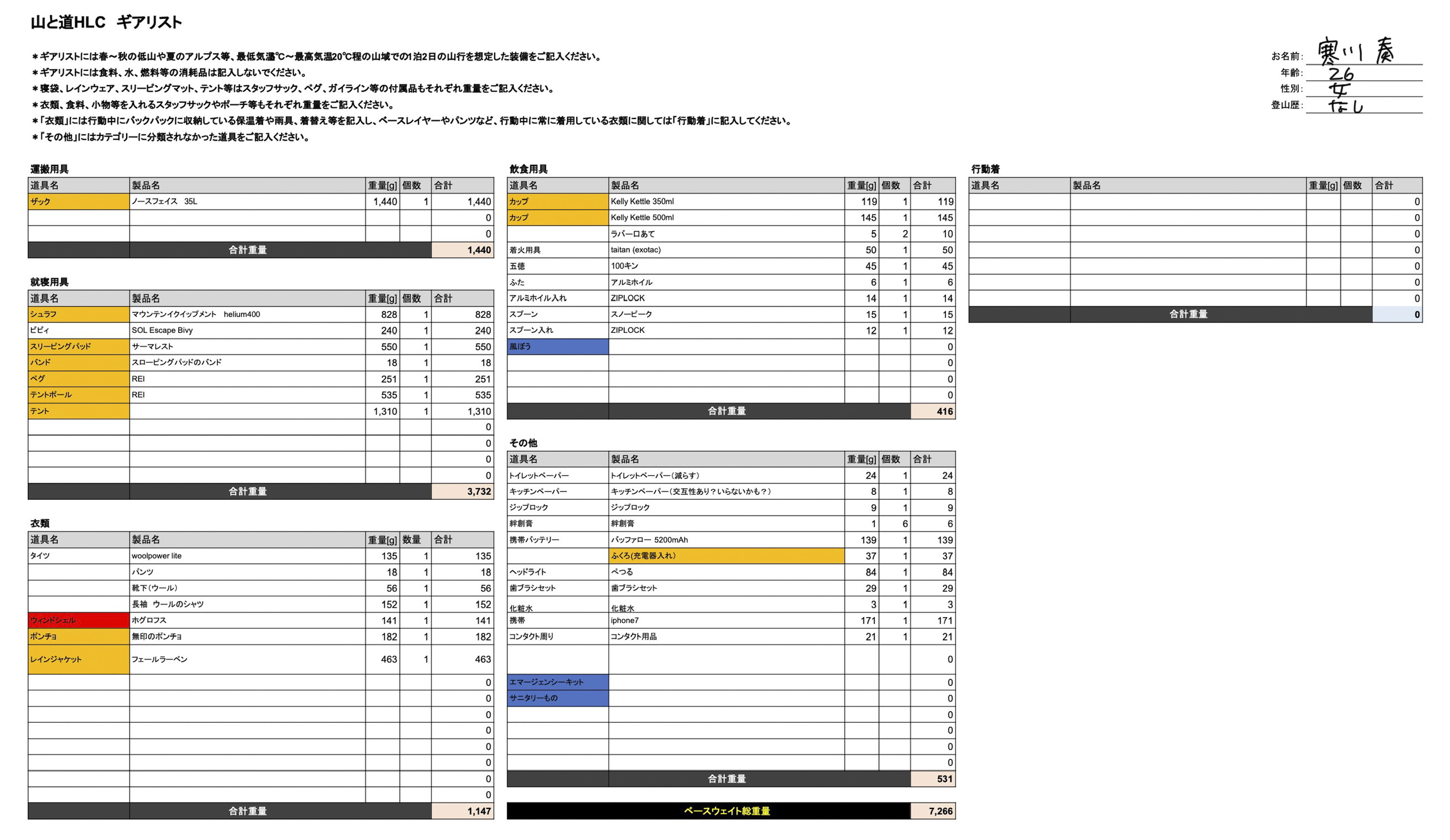 完成したリストを見ながら、お互い反省改善タイム。リスト上でもう持っていかないと確信するものは赤に、要変更のものは黄色に、次も持っていこうというものは青に塗り替えた。私のギアリストはピカチュウを思い出させるほどに黄色い。