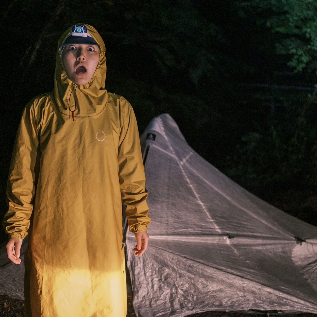 真っ暗な道志の森キャンプ場に到着。小雨の中テント設営開始。早速UL-All weather Long Hoodyが活躍。雨が気にならないし何故か私が着るとファニーで楽しい。