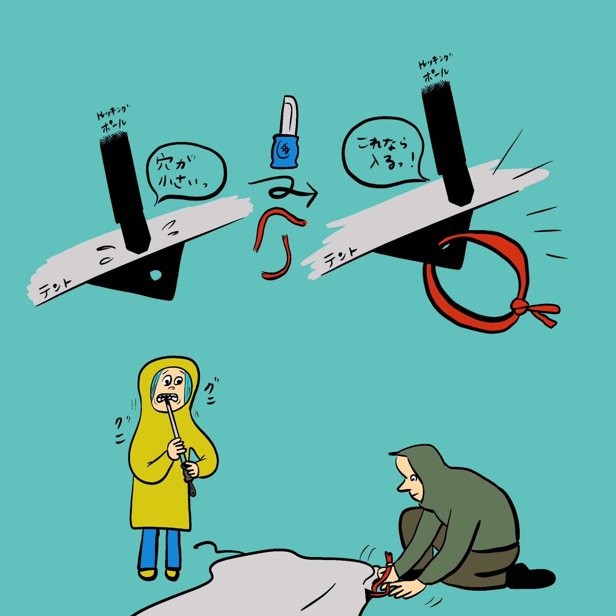 このテントは2本のトレッキングポールを支柱にして立たせる仕様。まずはテントの金具部分にトレッキングポール先端をはめるためにポールのキャップを外すのだがこれがなかなか取れない。ポール先端をはめるテント側の穴が小さいため、ポールのキャップが外れていないとその穴にはめられず、テントを立てれない。もはや歯を使って外そうとしていた私の横で彼は新たなパーツを作り出していた。持っていたロープをナイフで15cmほどにカットし、先ほどのテント側の穴に通し輪を作る。新たな穴ができた! キャップを外さずともポールを立てることができた。脳の筋肉と経験の差を感じる。