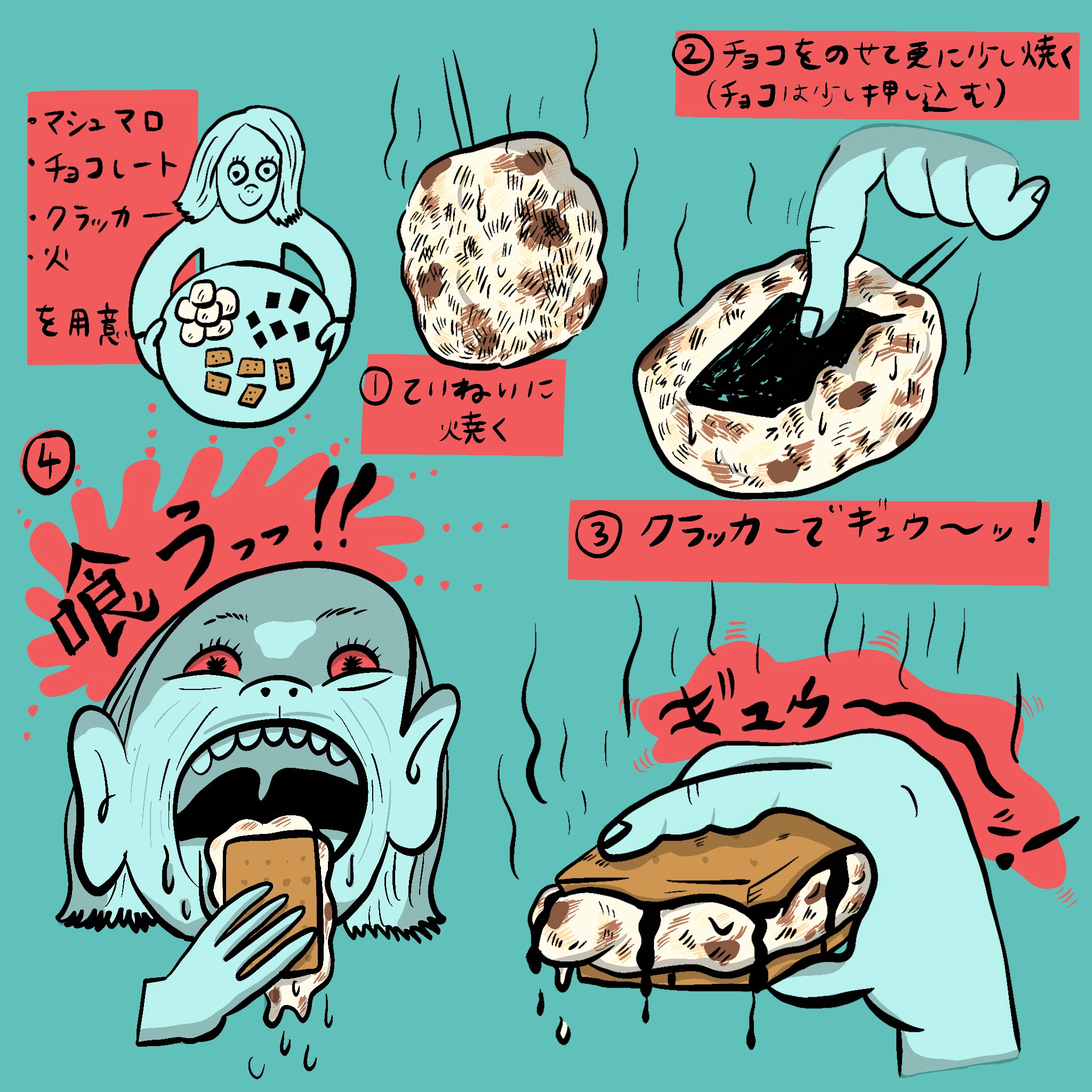 雨が弱まってきた。焚き火の時間。鉄製の焚き火台は割と重いのでこのためといえばクルマできた意味はあったと思う。5分とかからず火をつける彼。私はあと3年後かな…。持ってきたマシュマロを焼き、膨らんできたらダークチョコレートを乗せて、もう少し焼く。チョコレートに照りが出てきたらビスケットで挟んで豪快に食らいつく。コツは火に近づきすぎず絶妙な距離を保ちながらゆっくり、ゆっくり焼くこと。最高に旨い。サービスエリアで牛丼とメロンパンを食べたがこの大好きなスモアサンドも3個ほど食べた。体のUL化という前回掲げた目標はこの激うま脳みそとろけフードの前では無力だ。