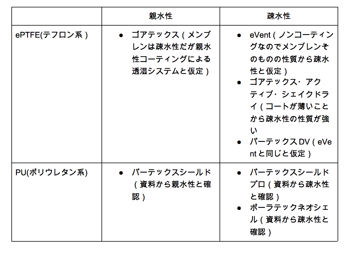 注:疎水・親水の区分には仮説を含んでいます。メンブレンが疎水でも素材全体の性質として親水と解釈したものもあれば、シェイクドライのようにざっくりと仮定したものまであります。