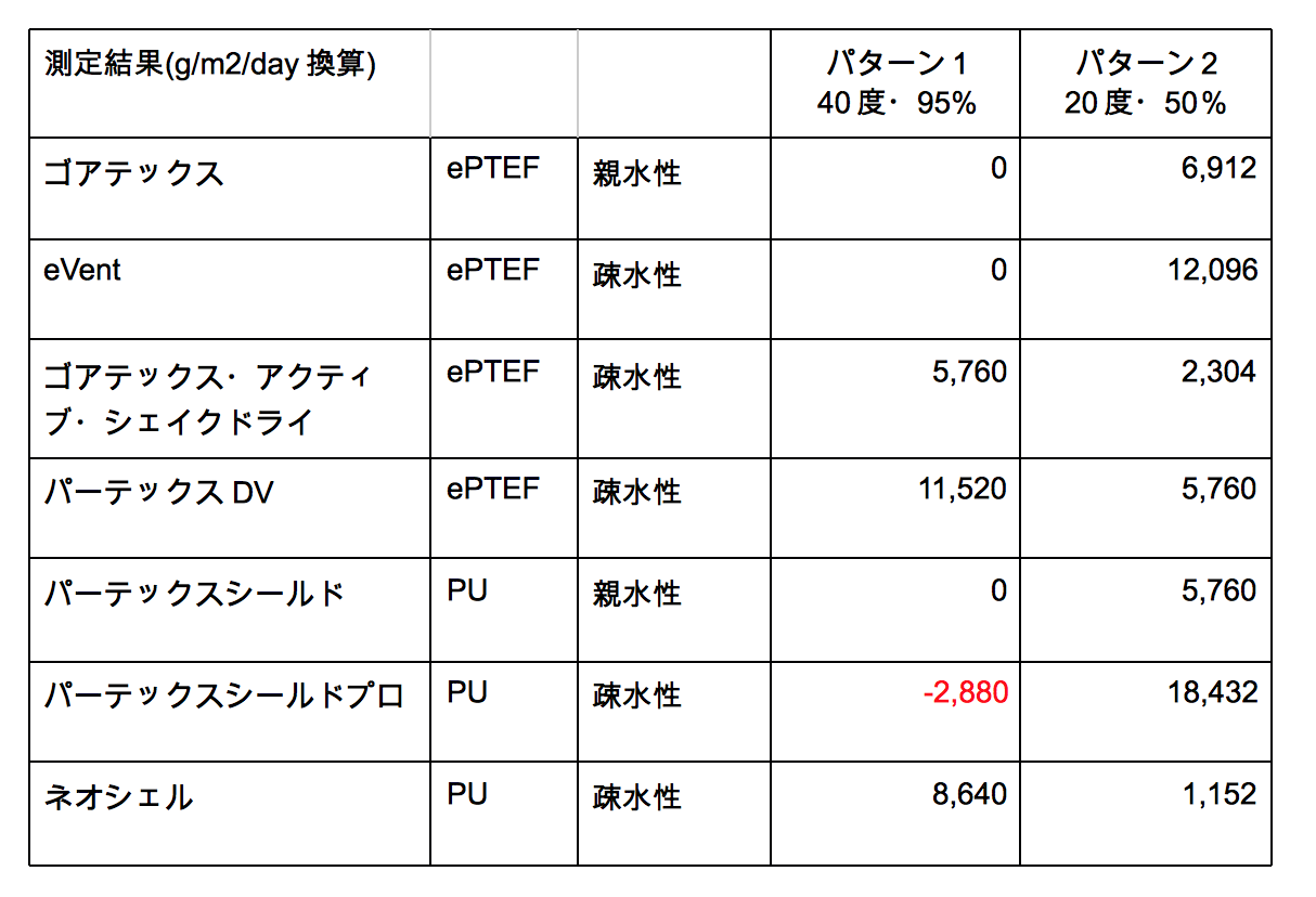 以上を総合すると、透湿性においてもっとも有利な素材はePTFEかつ疎水性の素材であると思われる。該当するものはeVent(パーテックスDV)、ゴアテックス・アクティブ・シェイクドライ。ゴアテックスについてはシェイクドライだけでなく、コーティングの薄いゴアテックス・アクティブやゴアテックス・プロも同等の性能である可能性が高い。