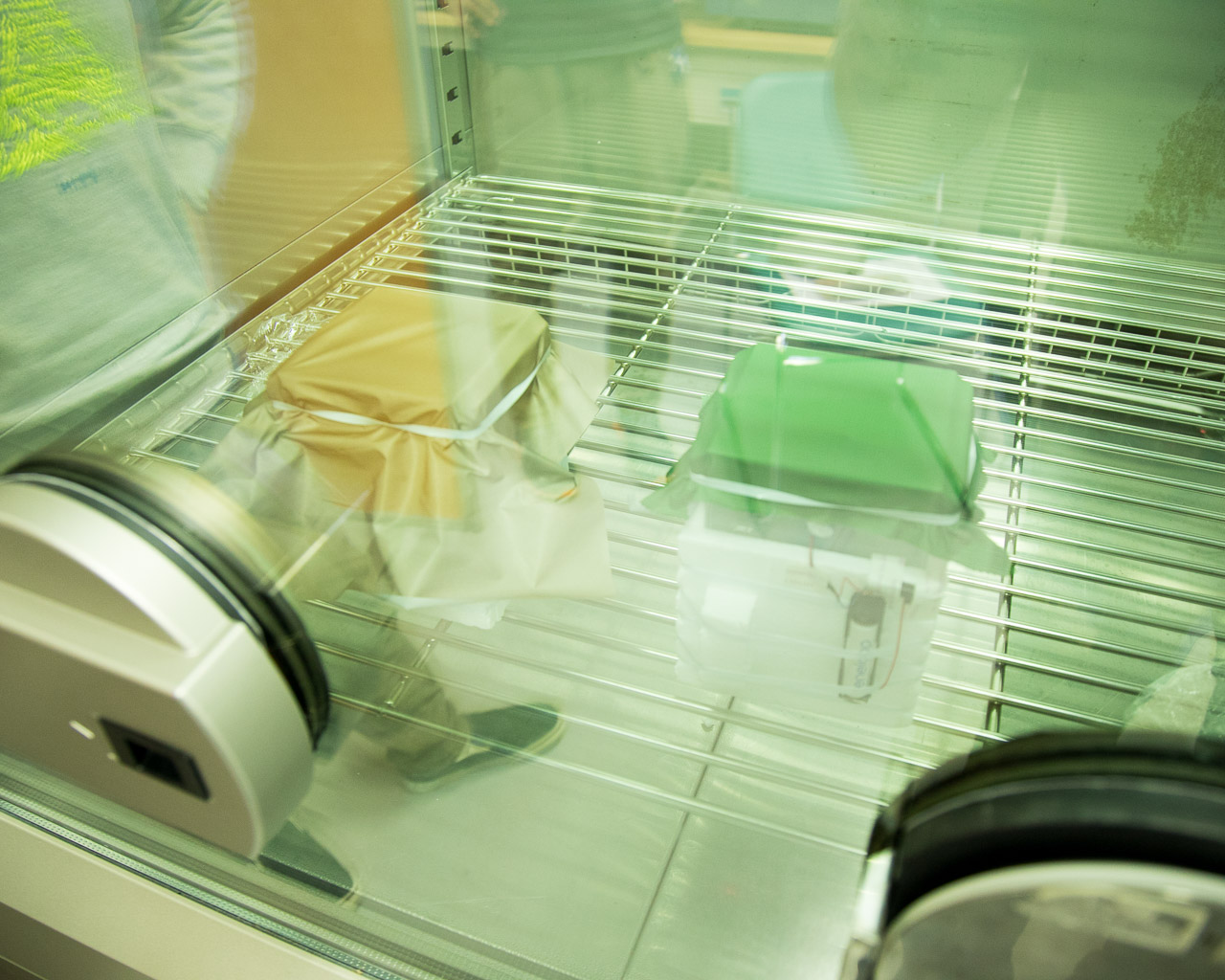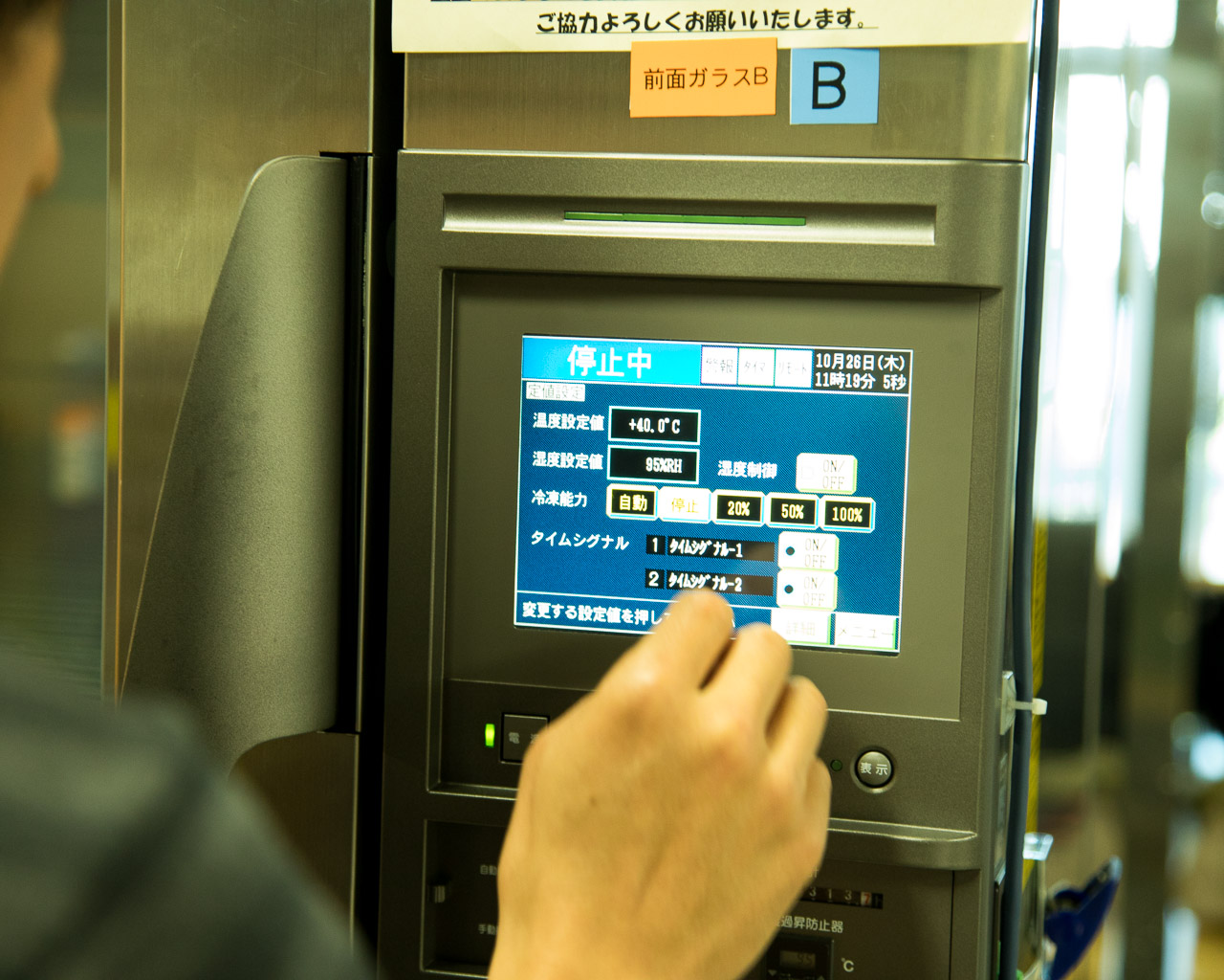 こちらが今回用いた恒温恒湿装置です。内部に手を入れて装置を操作できます