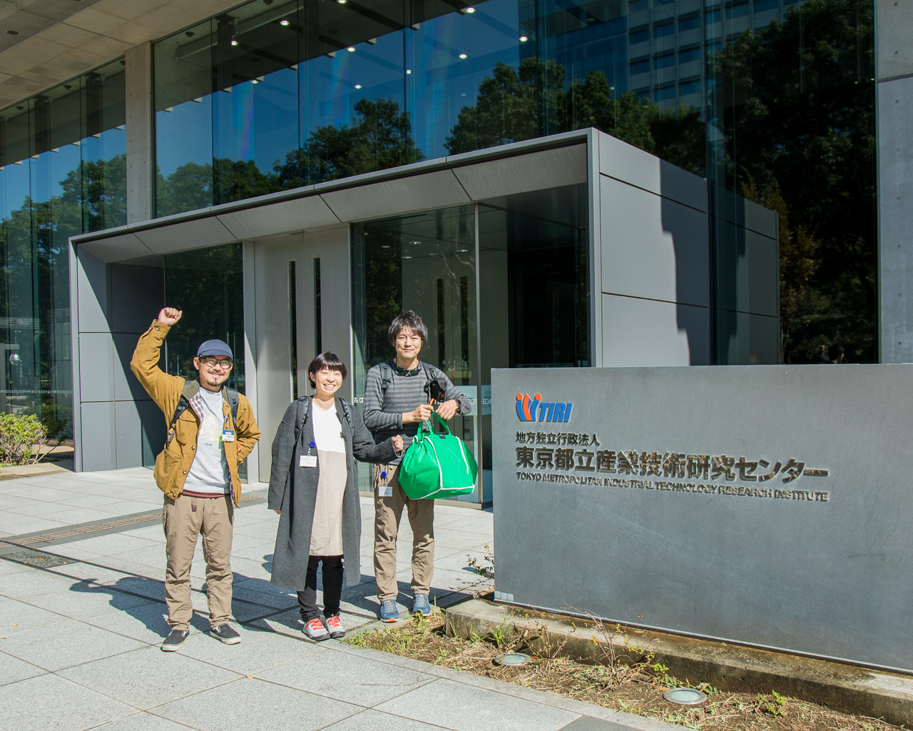検査は東京お台場にある都立産業技術研究センターで行いました。試験に意気込む一同は、左より夏目所長、松本研究員、渡部研究員。