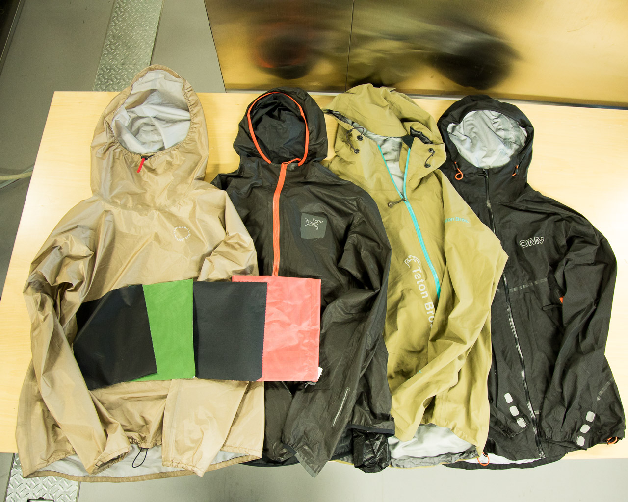 1つは、レインウェアの素材として2大勢力であるePTFE(テフロン系)とPU(ポリウレタン系)の差異を、複数の素材で比較したいということ。